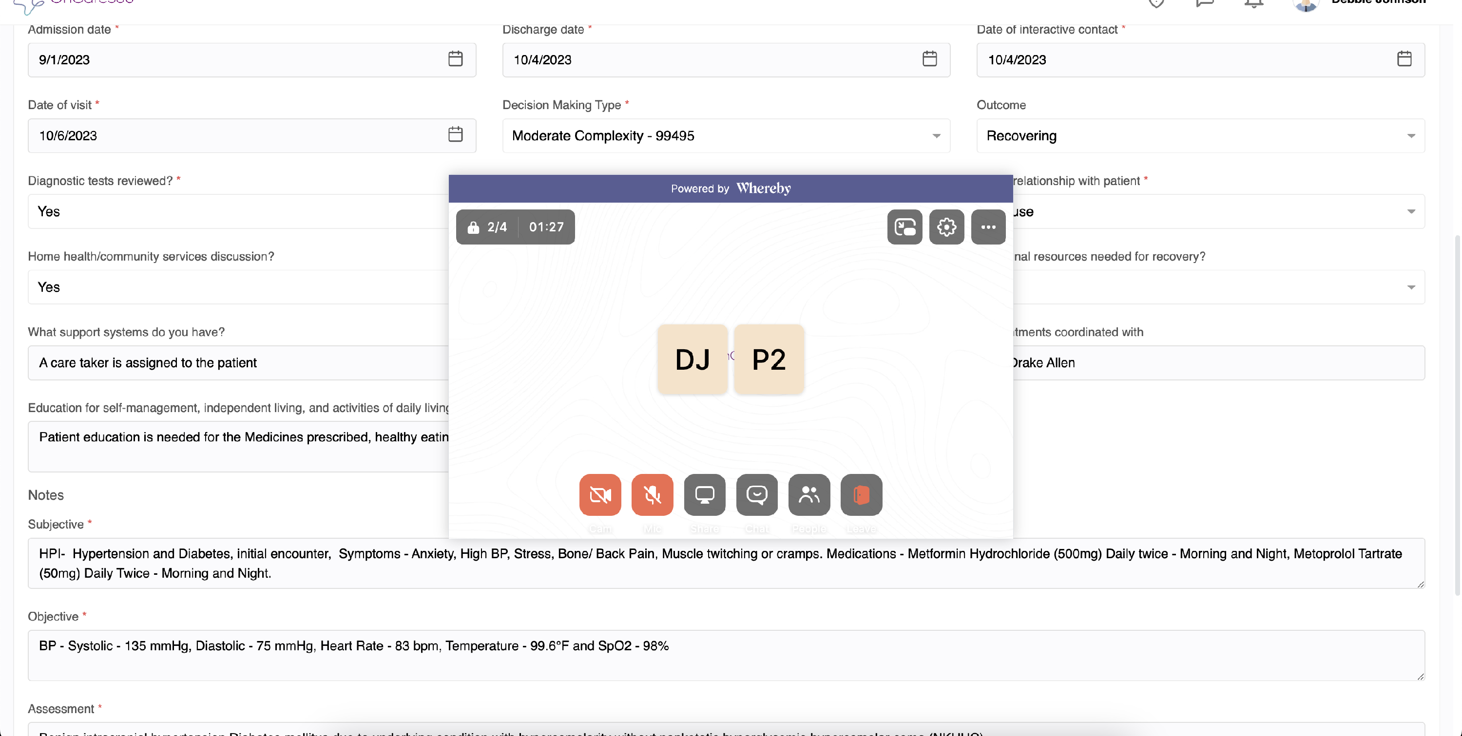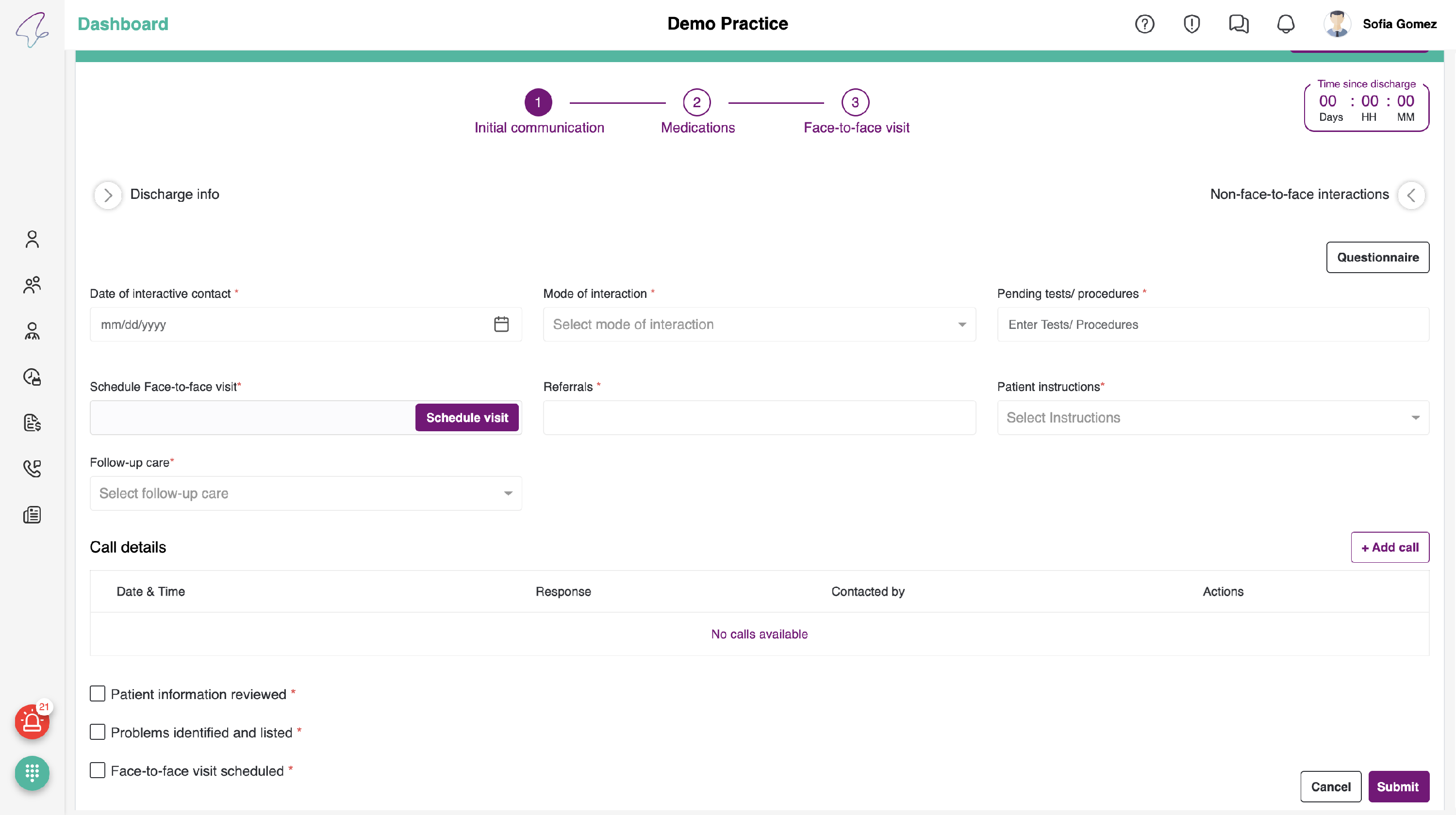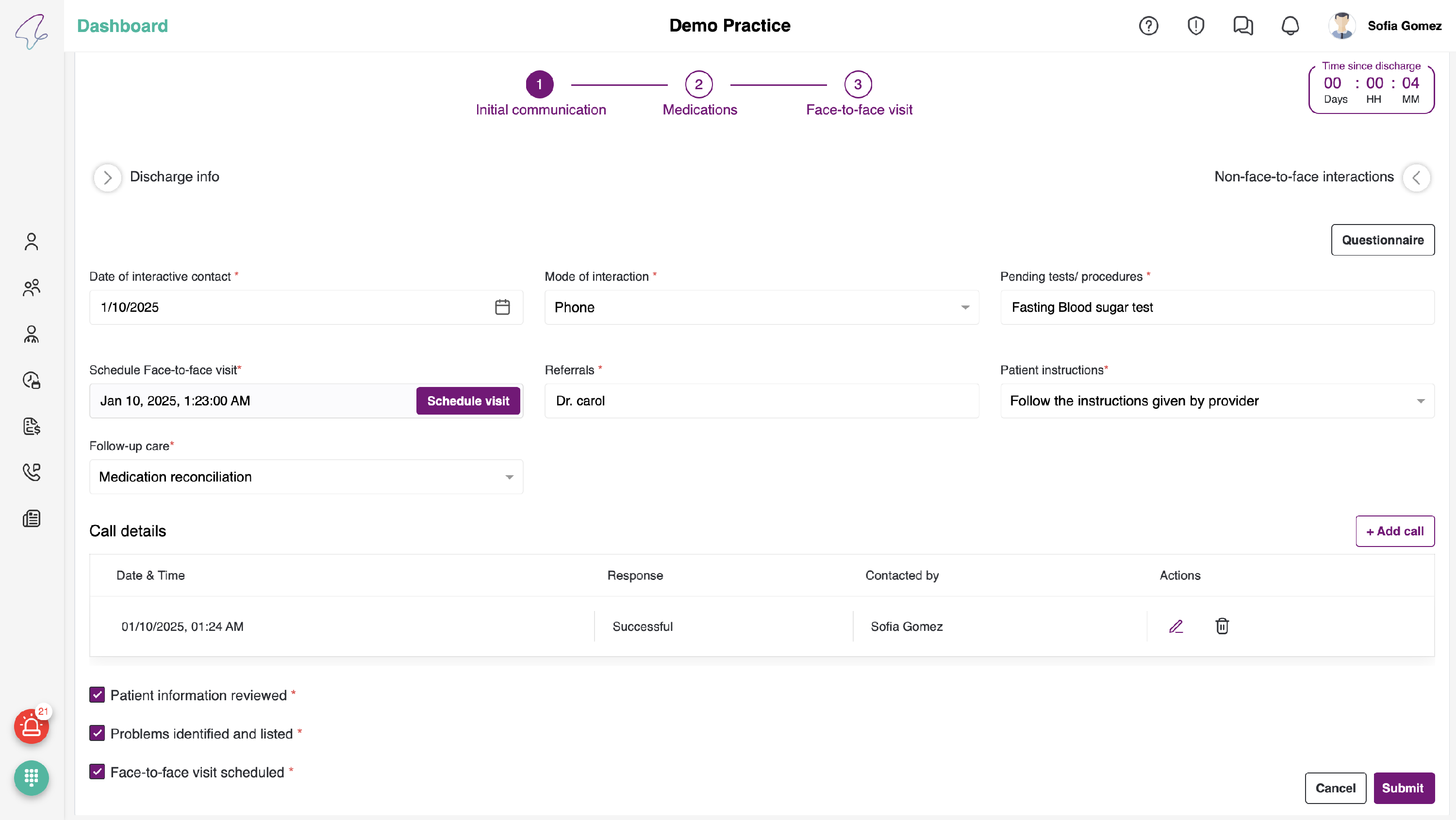 - Fill all other details and check the boxes to confirm that you have reviewed the patient information, identified problems and scheduled a Face-to-Face call. Once done, click on submit.