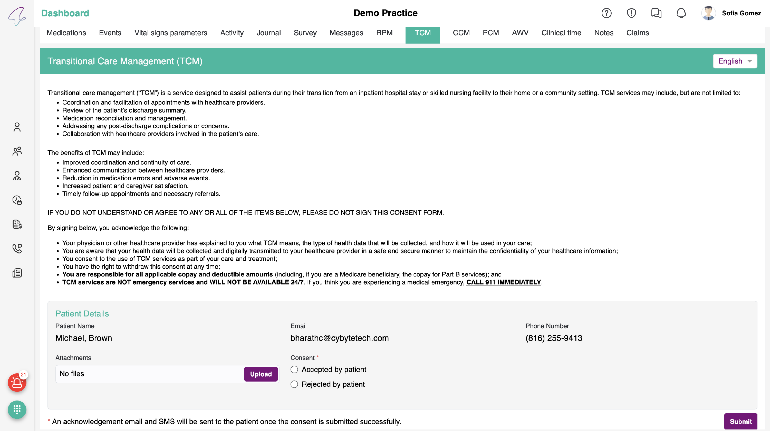 - Click on "New TCM Episode" Button. Consent screen appears.