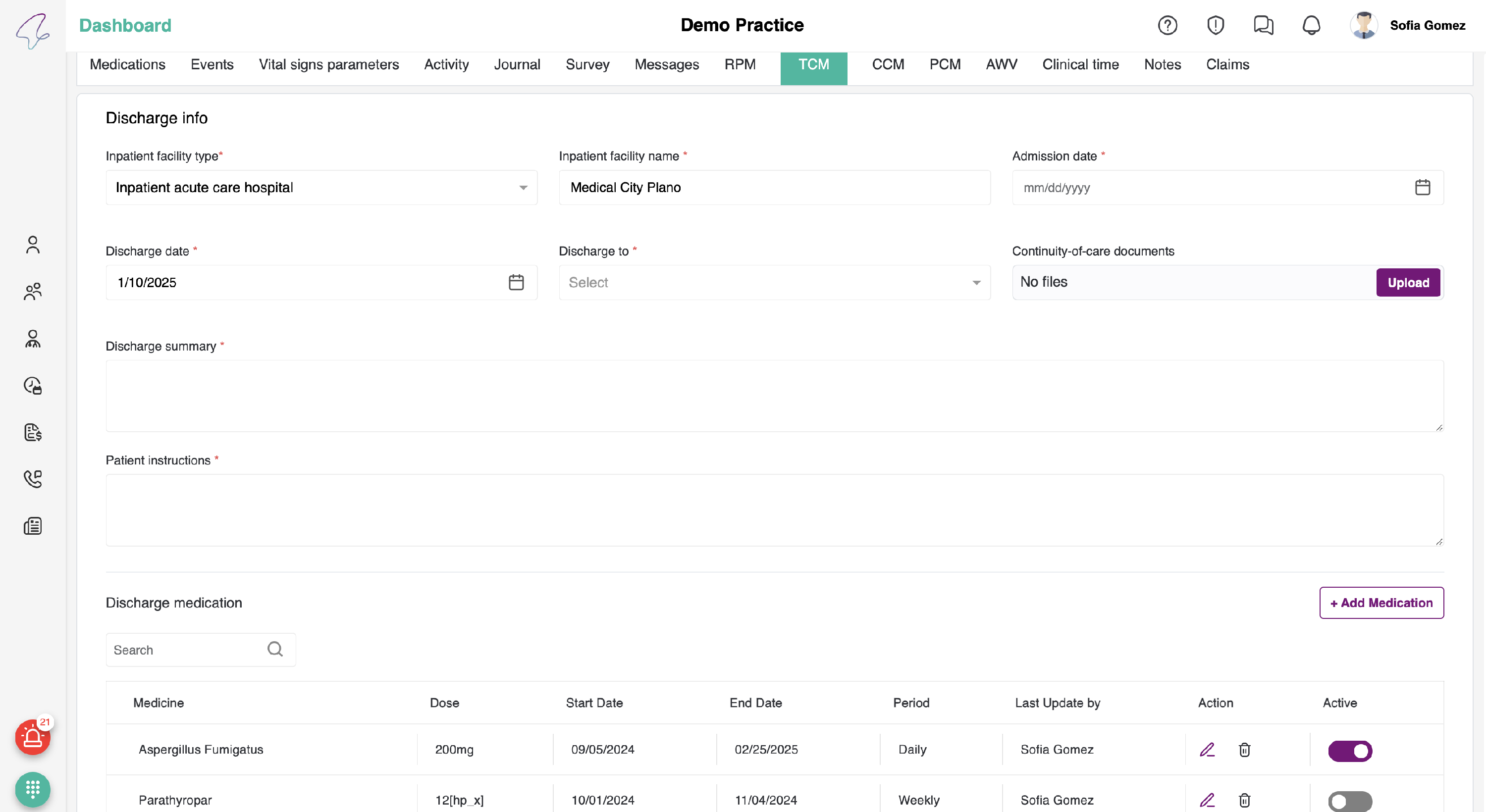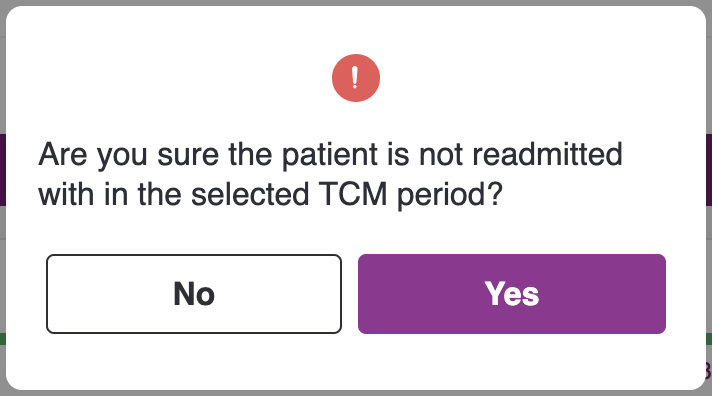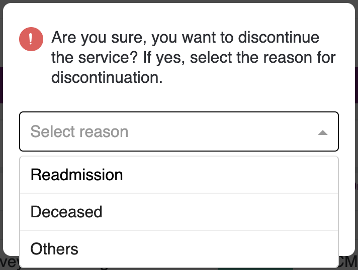 - We can select the reason for discontinuing the TCM Episode from the dropdown - Readmission, Deceased and Others. And then, click on the Discontinue button.