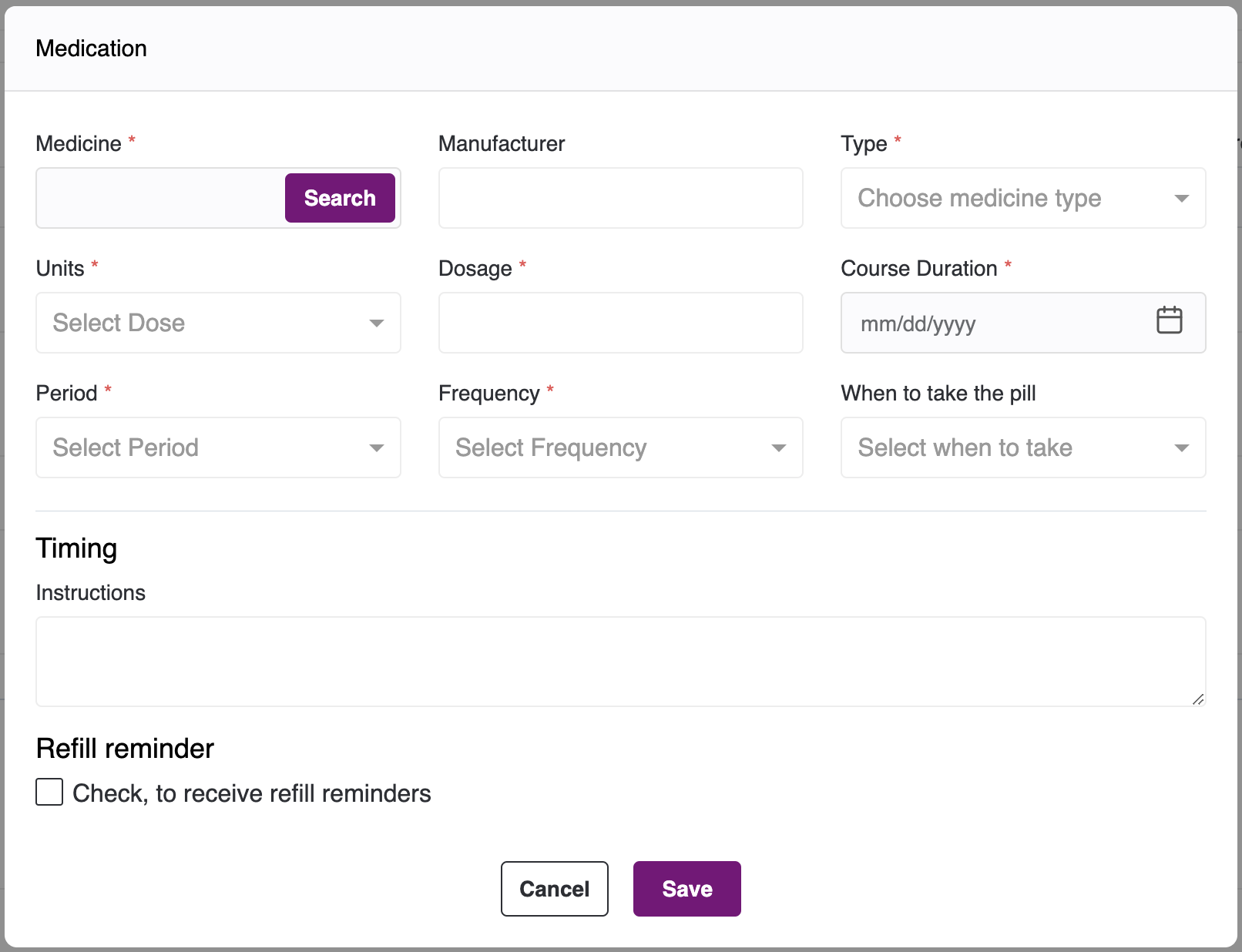 - If we want to add any medications, we can click " Add Medication" Button. Add Medication pop-up appears. Search the medicine you want to add and fill the other medication details and add the medicine.
