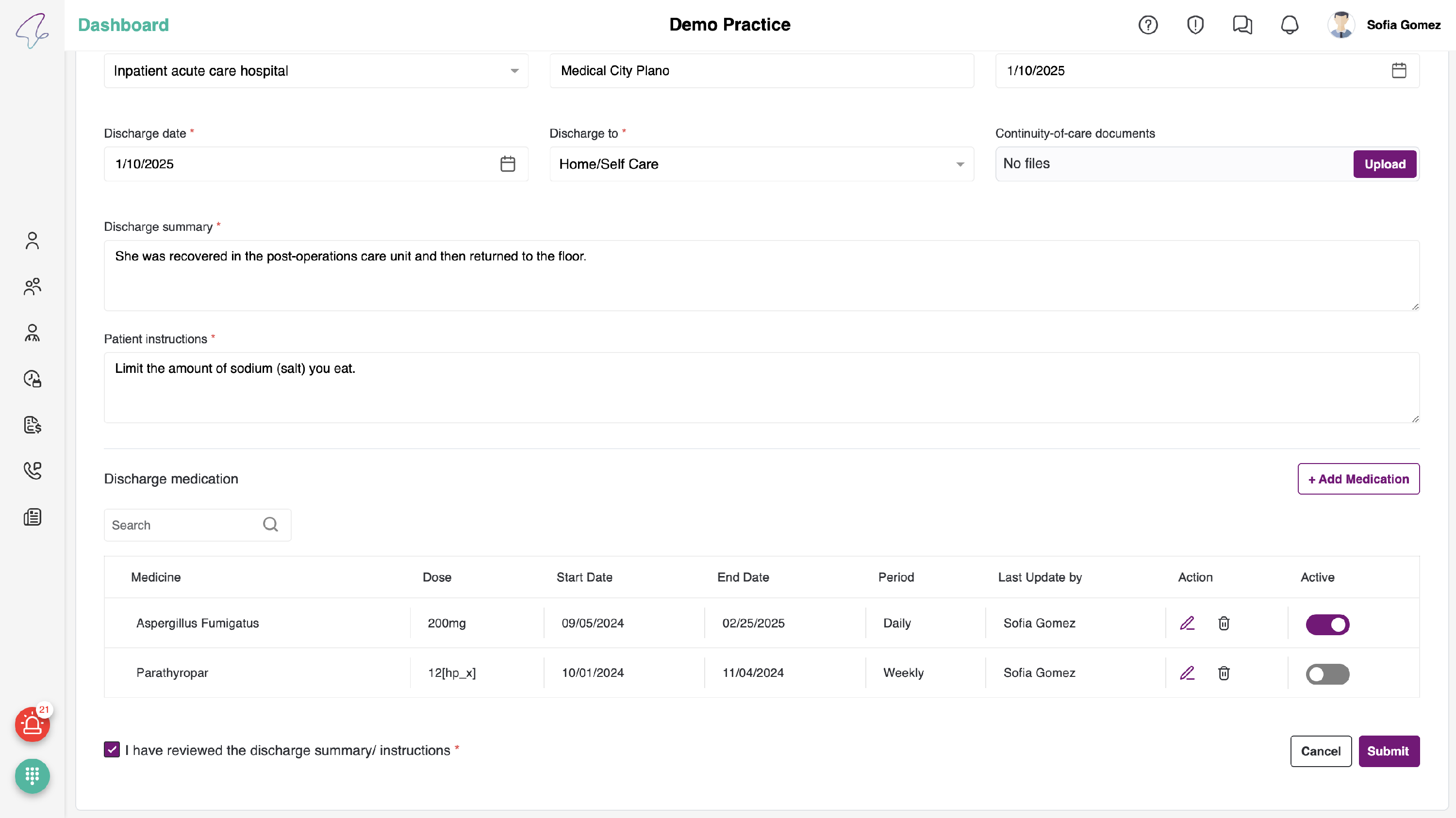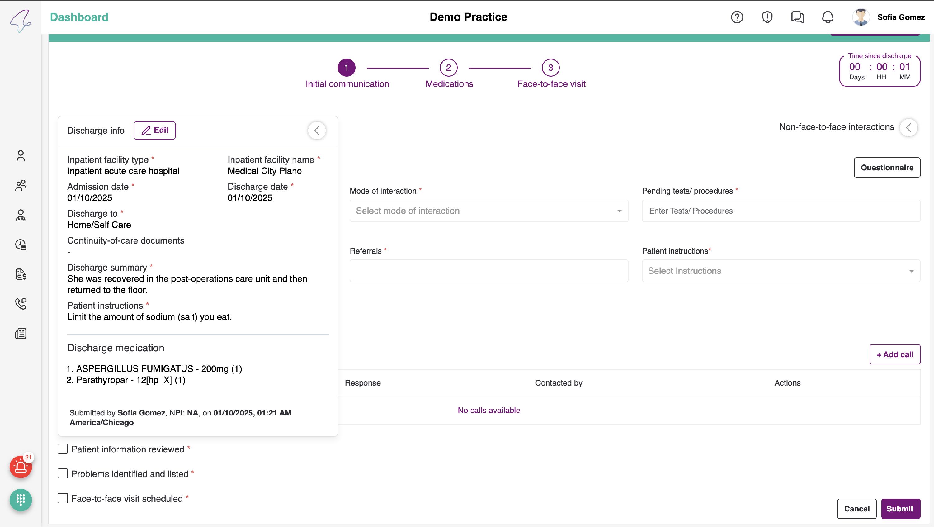 - Once after filling all the data, check the box on the bottom-left to confirm you have reviewed the Discharge Summary Instructions and click on the Submit Button. The Initial Communication screen appears.