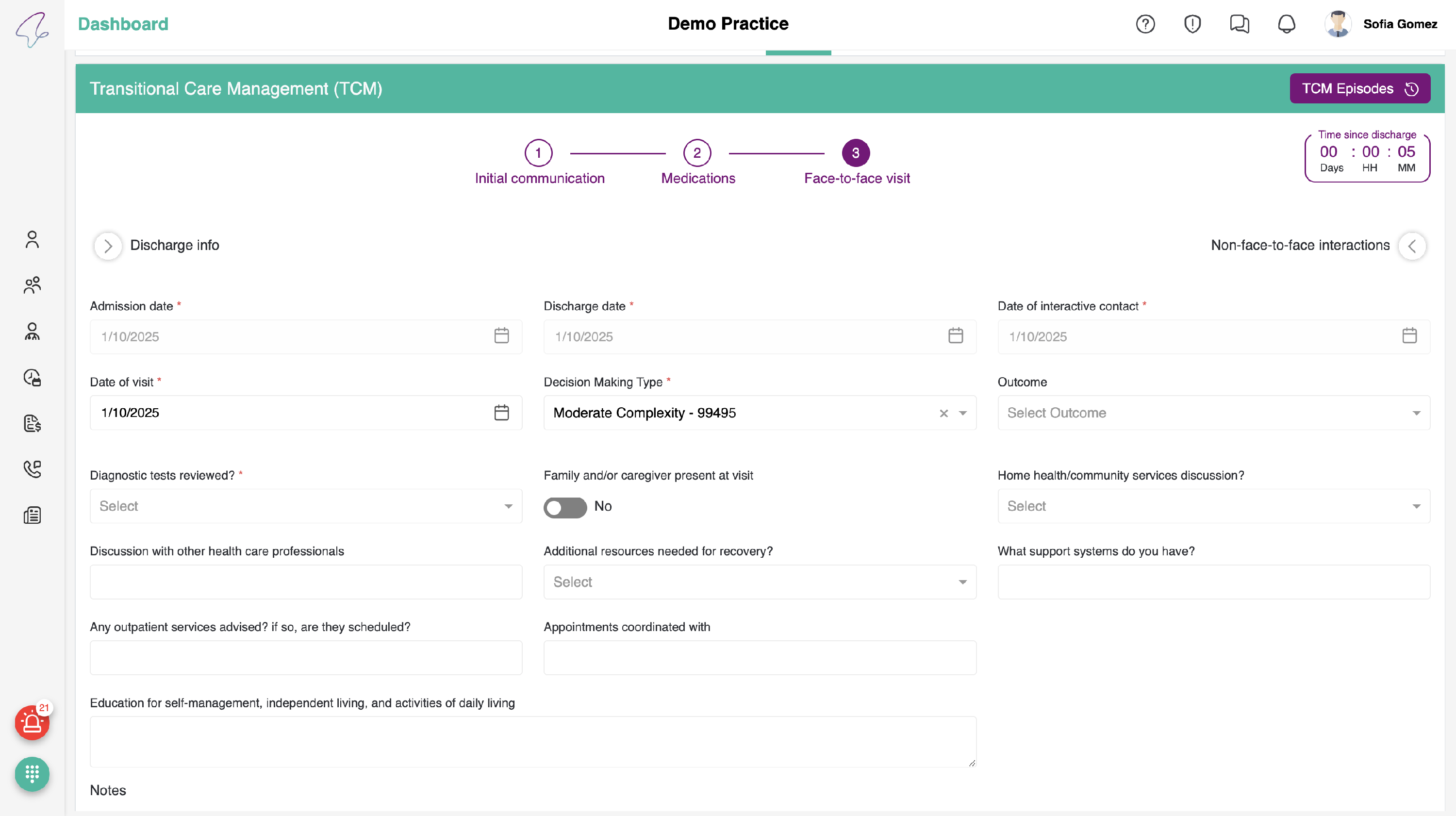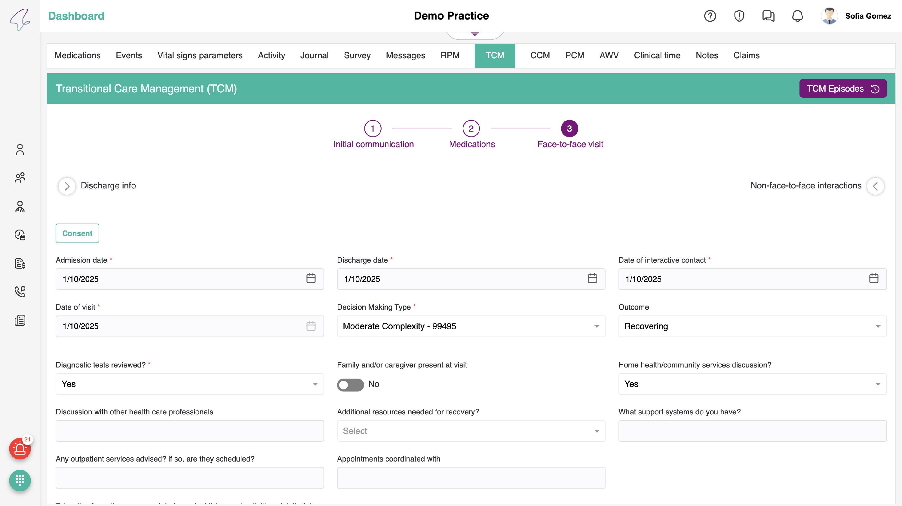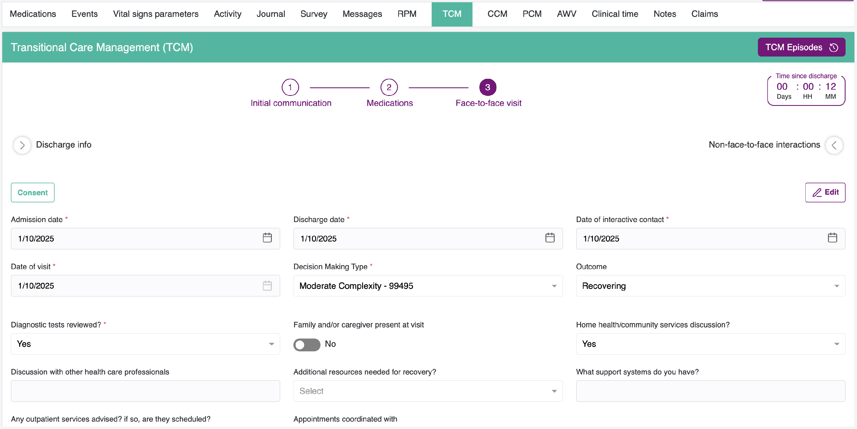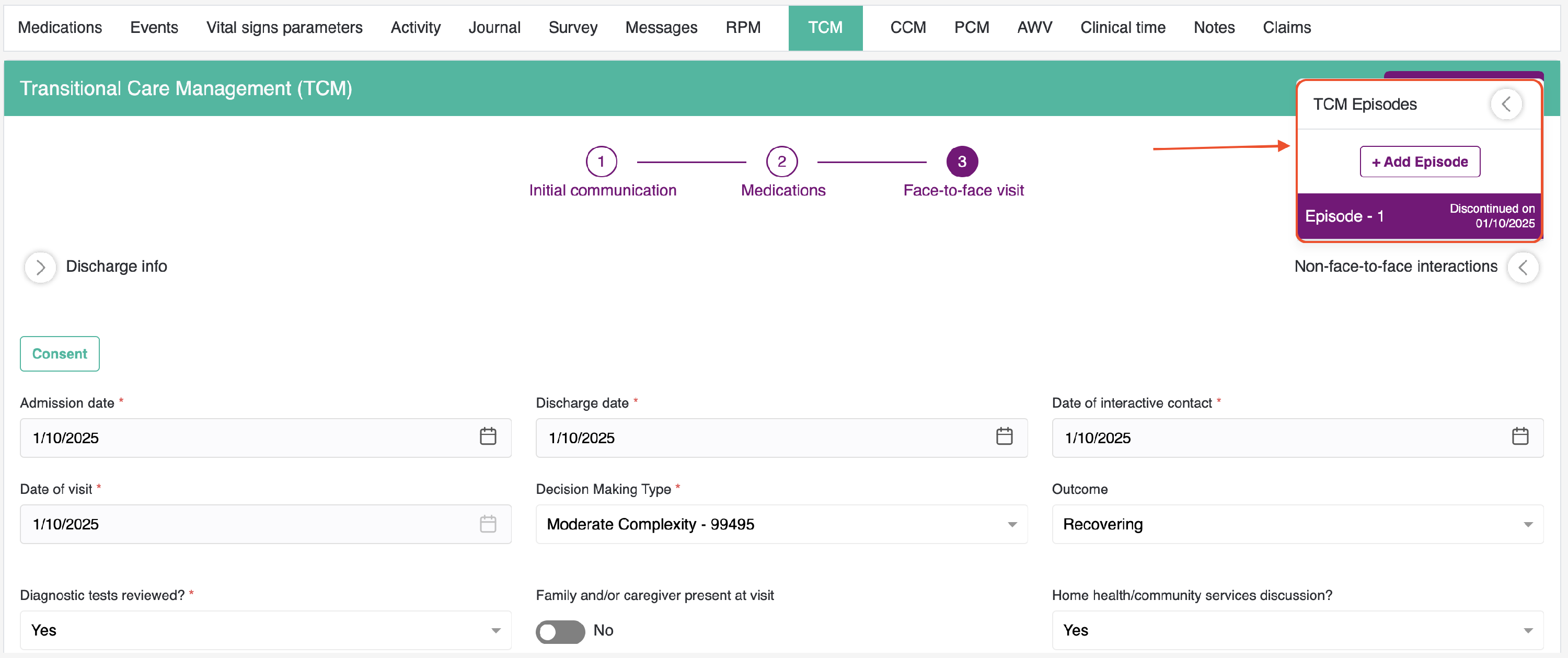 - Now that the TCM episode is added, we can navigate between the 3 sections. - Initial Communication, Medication Reconciliation and Face-to-Face Visit.
