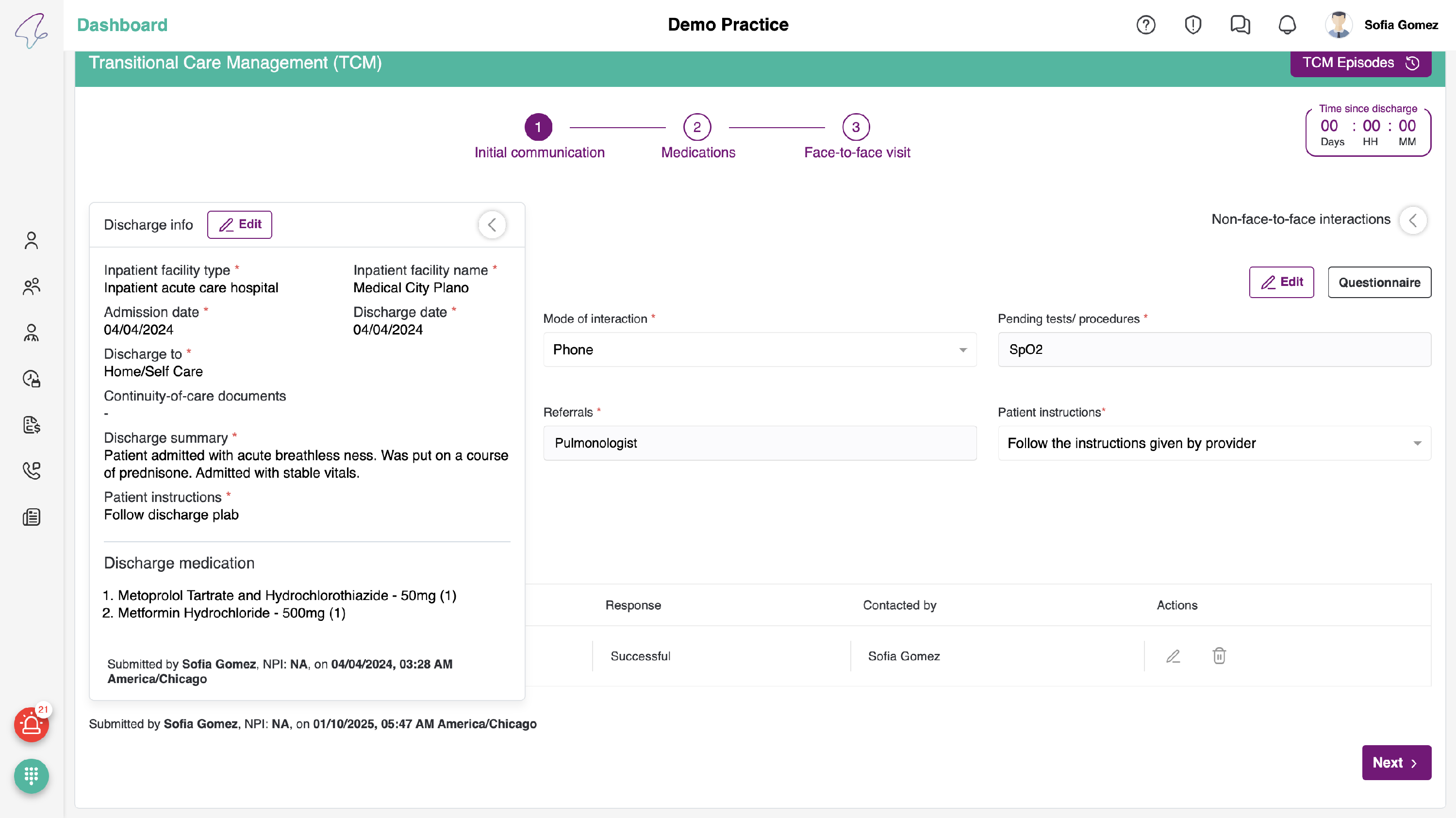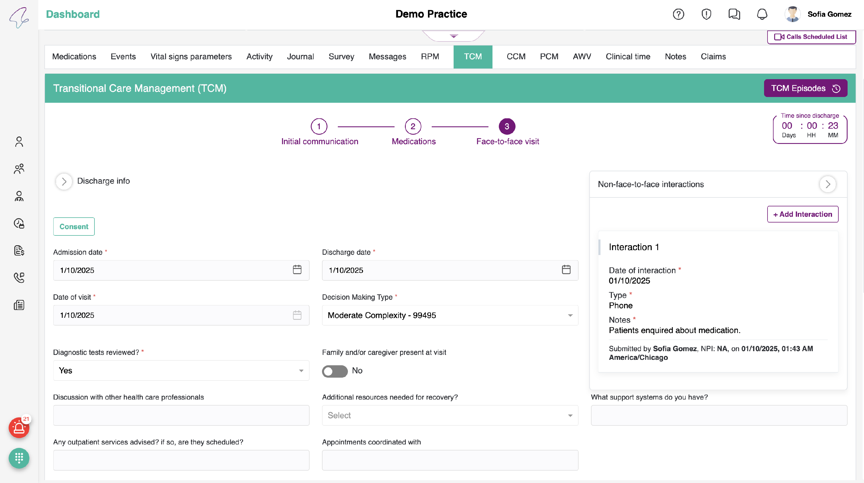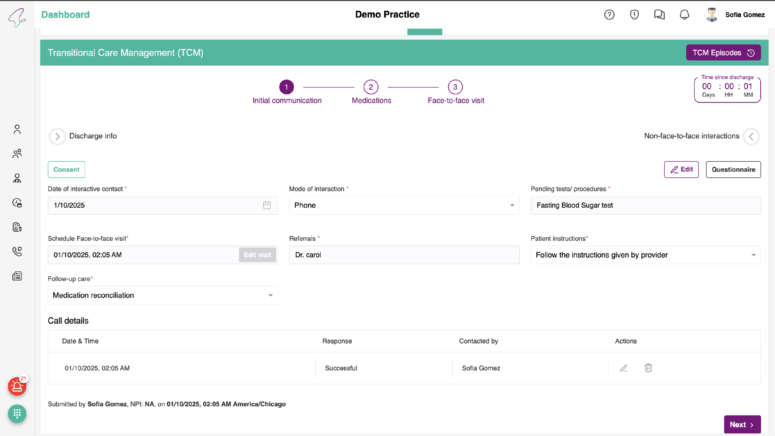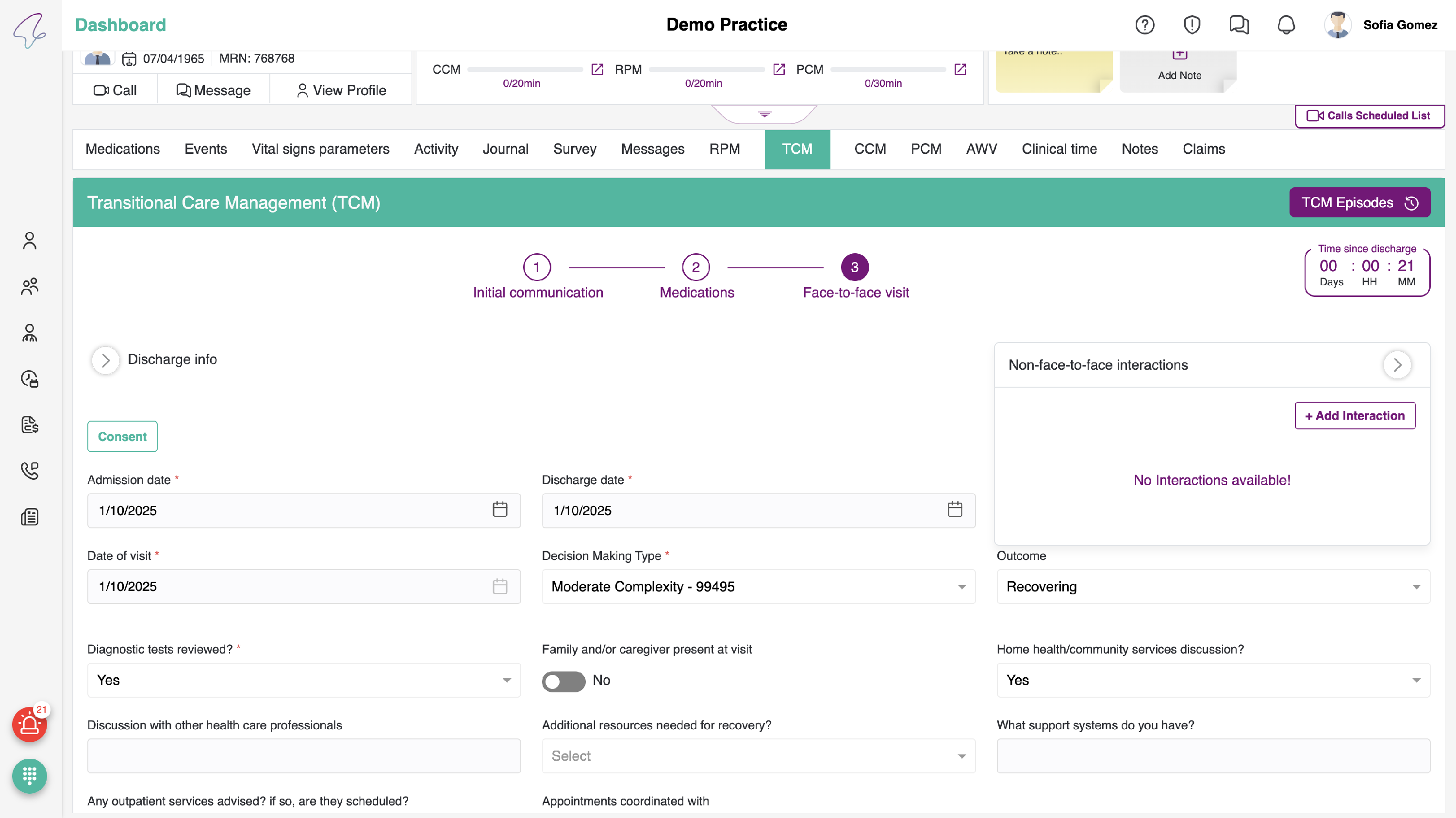 - Now that the TCM episode is added, we can navigate between the 3 sections. - Initial Communication, Medication Reconciliation and Face-to-Face Visit.