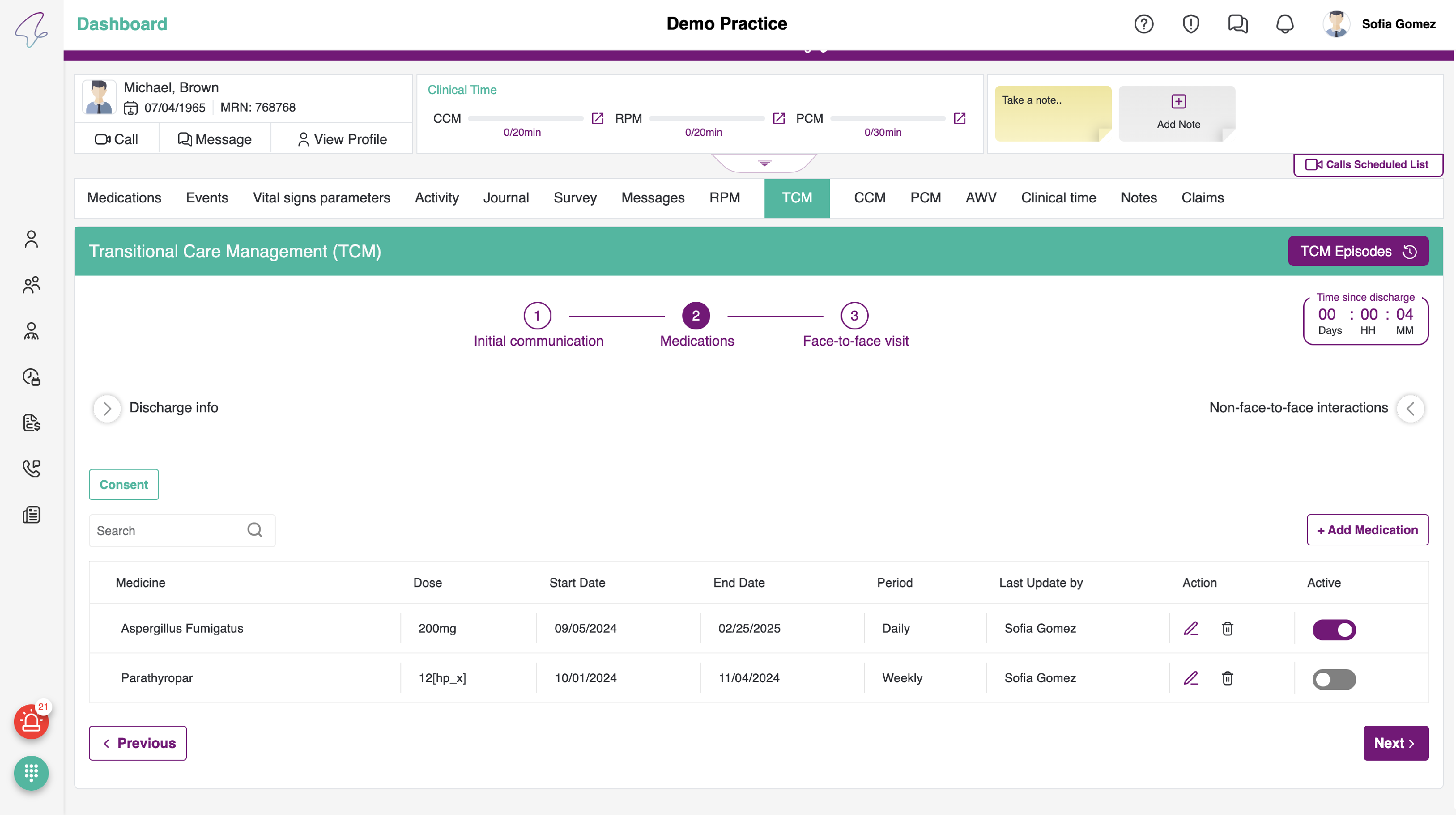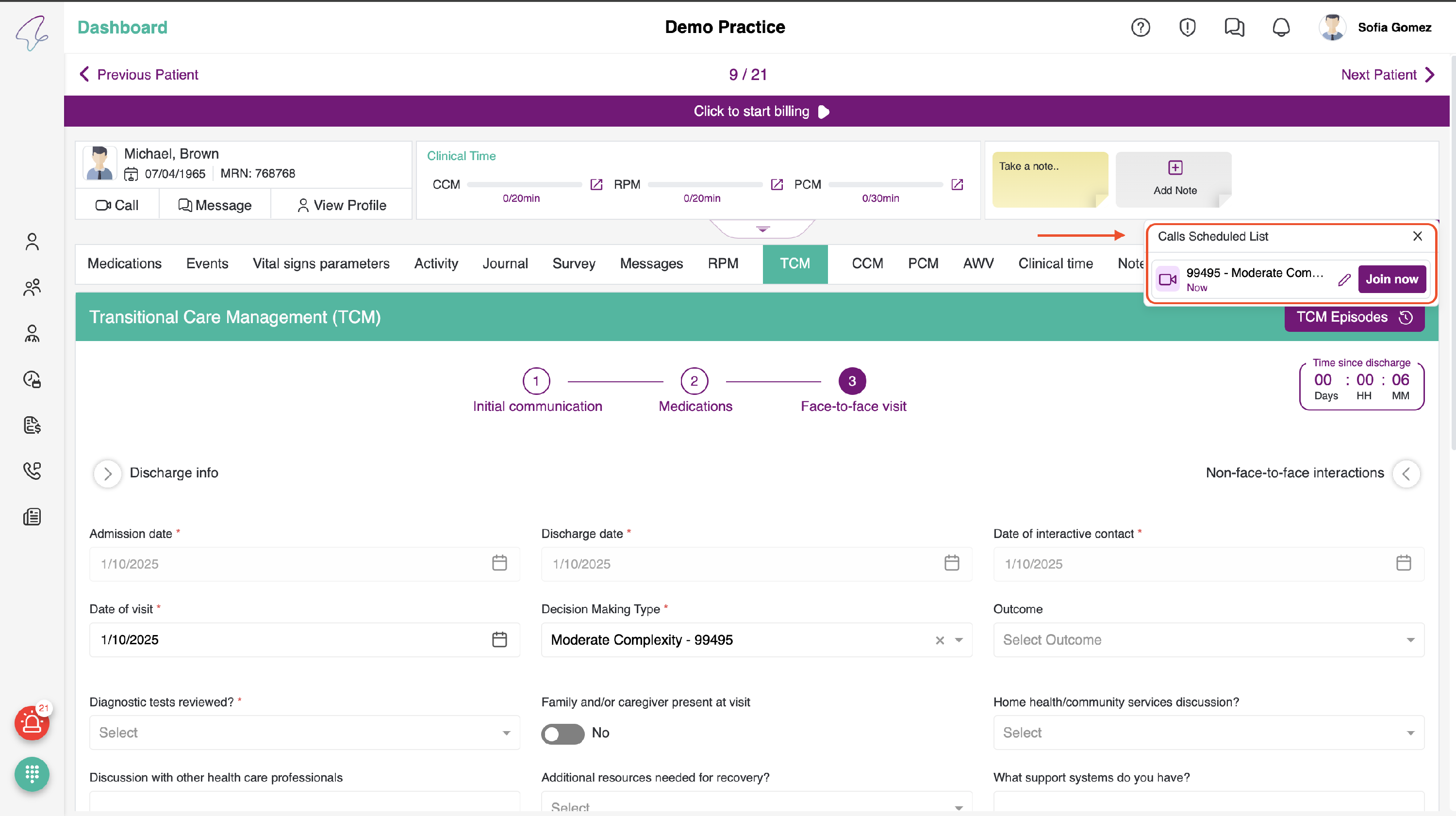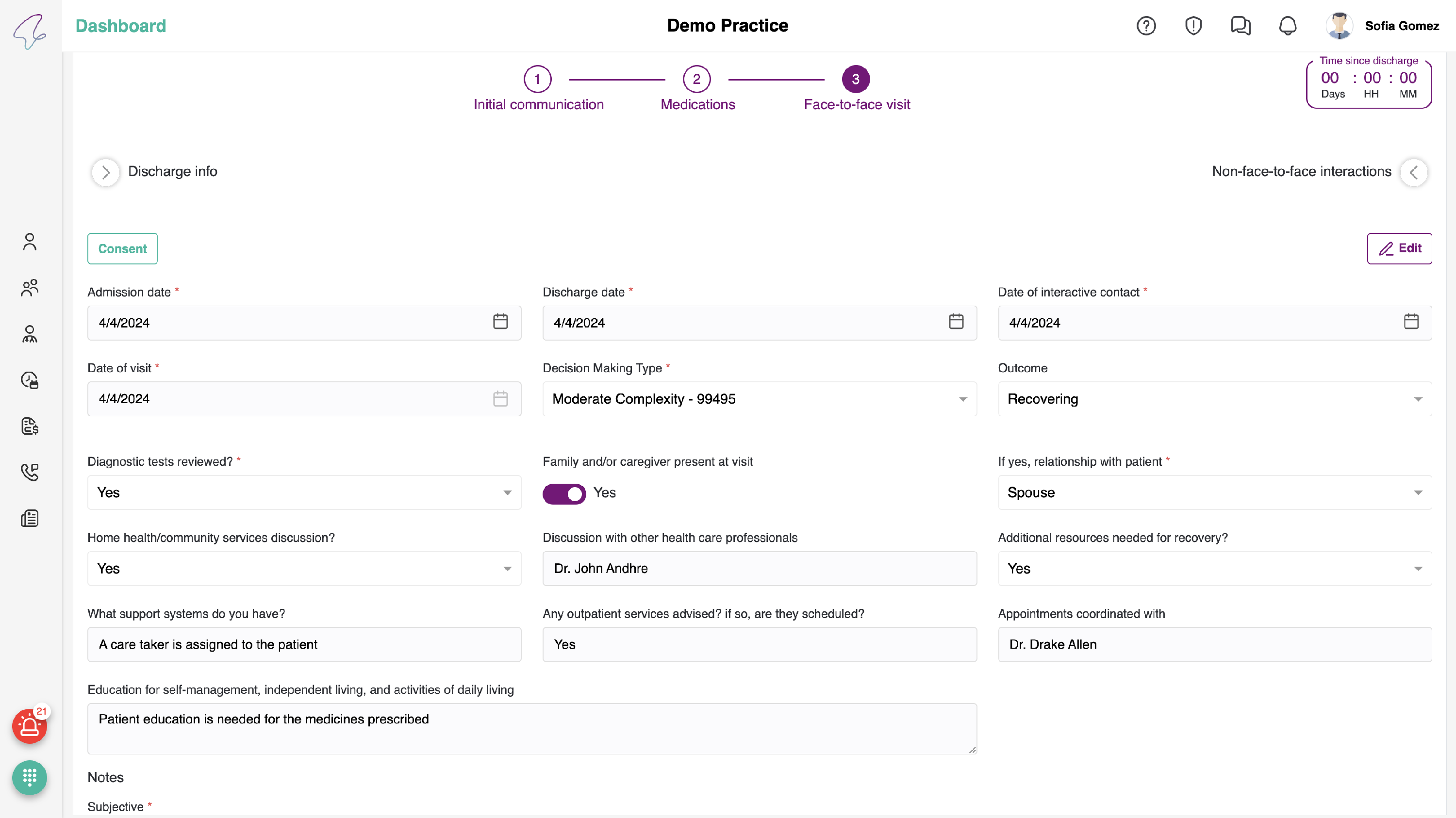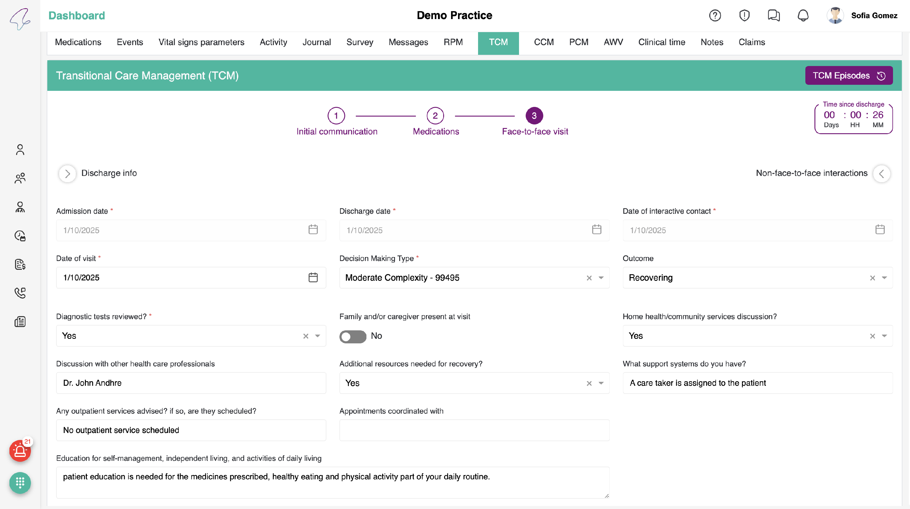 - Now that the TCM episode is added, we can navigate between the 3 sections. - Initial Communication, Medication Reconciliation and Face-to-Face Visit.