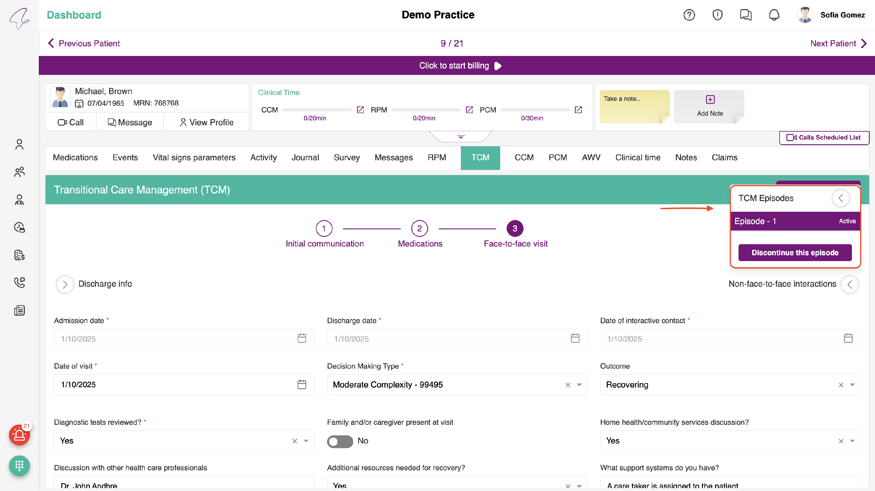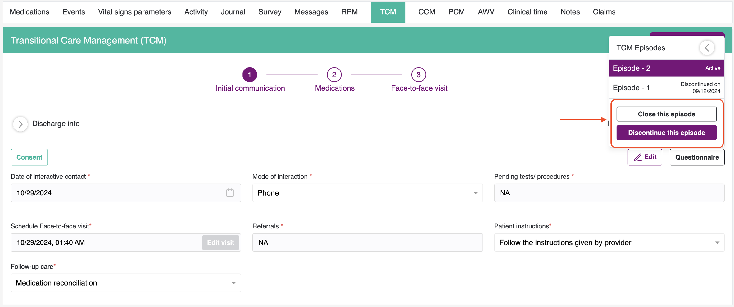 - We can see that there is only one active TCM episode, for this patient. And two buttons - Close episode and Discontinue episode.