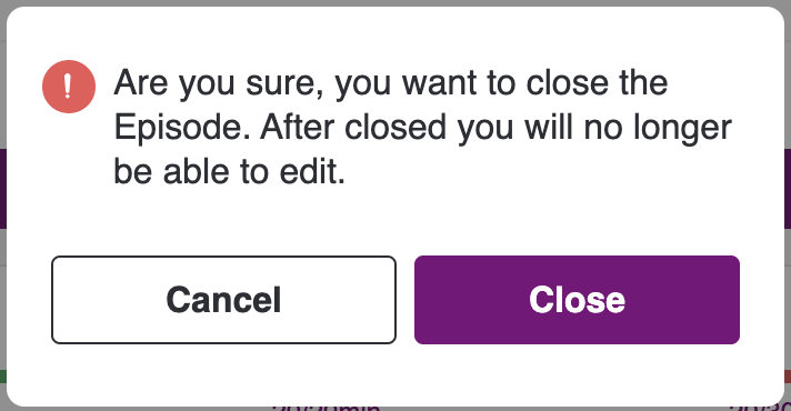 - You will view the following confirmation pop-up. Clicking on Close button will close the episode and the episode can only be viewed and not edited. On clicking Cancel, you will redirected back to the episode.