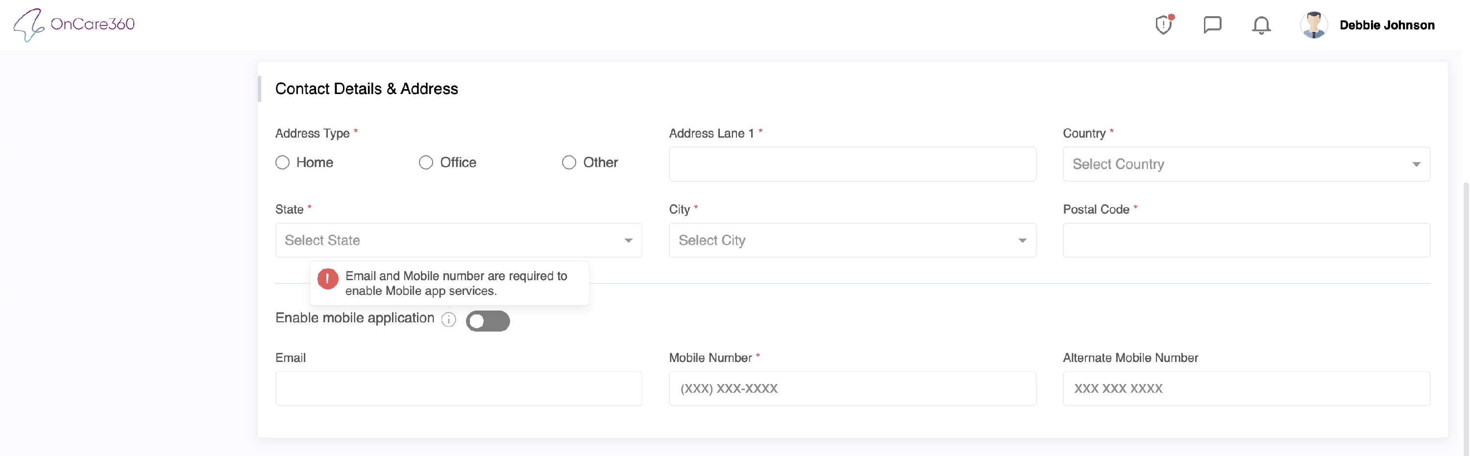 "Email and Mobile number are required to enable Mobile app services"