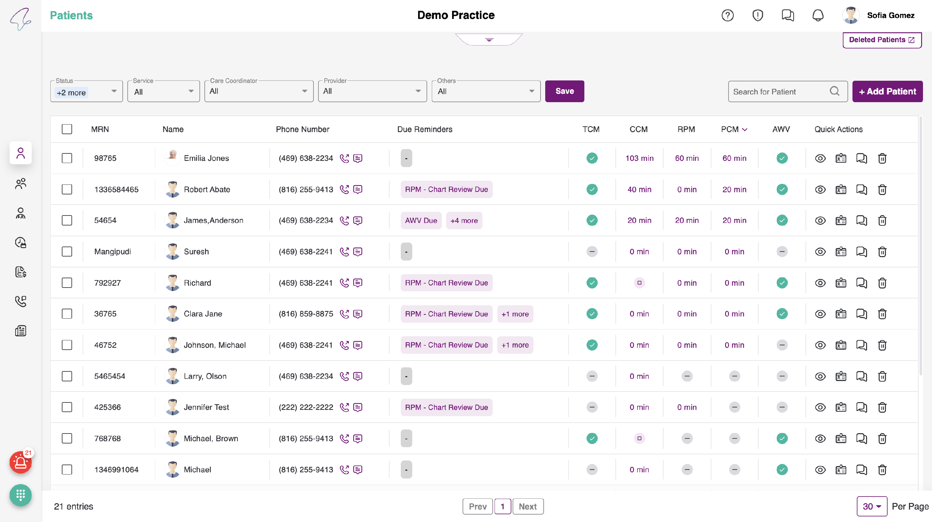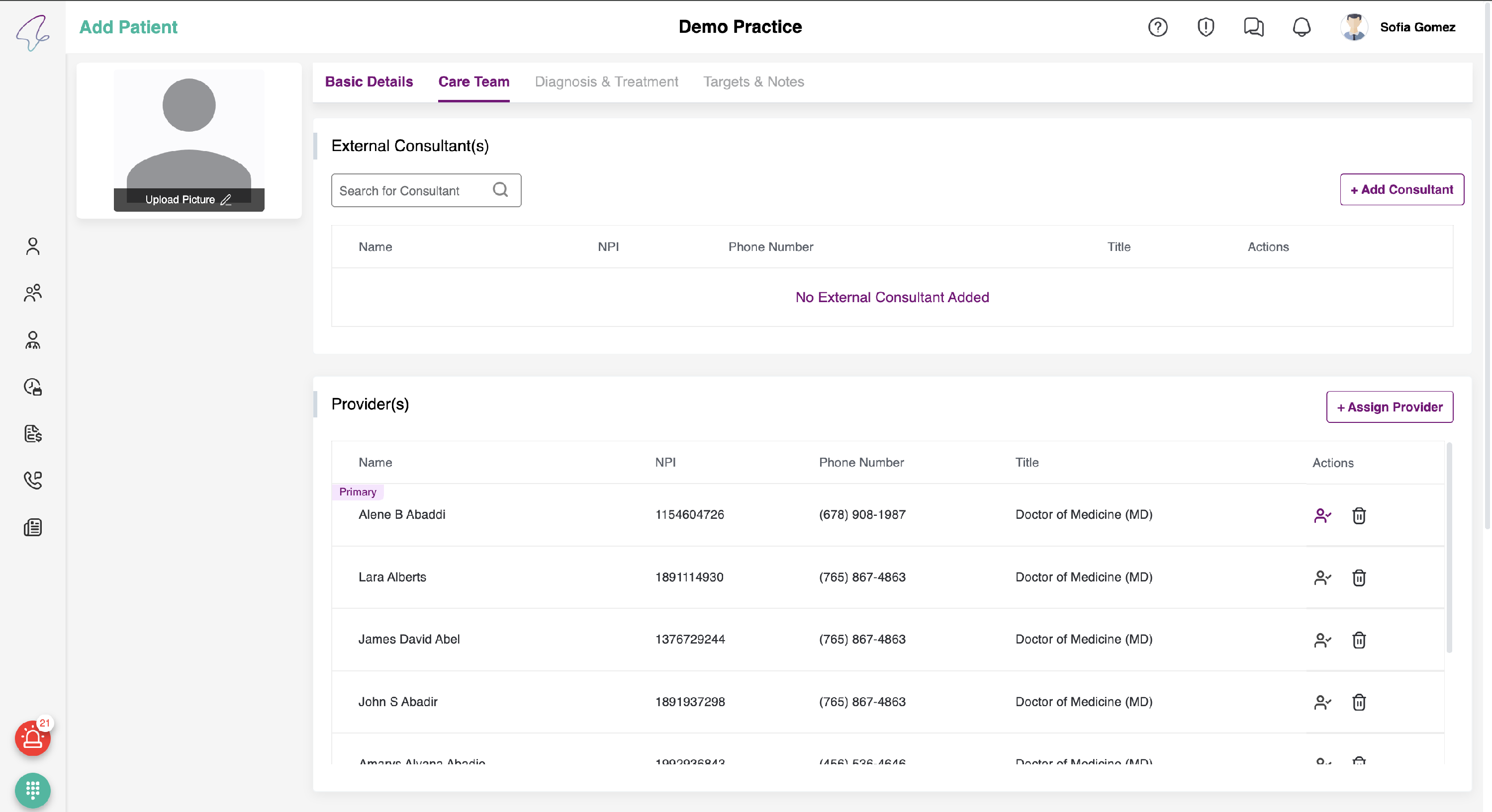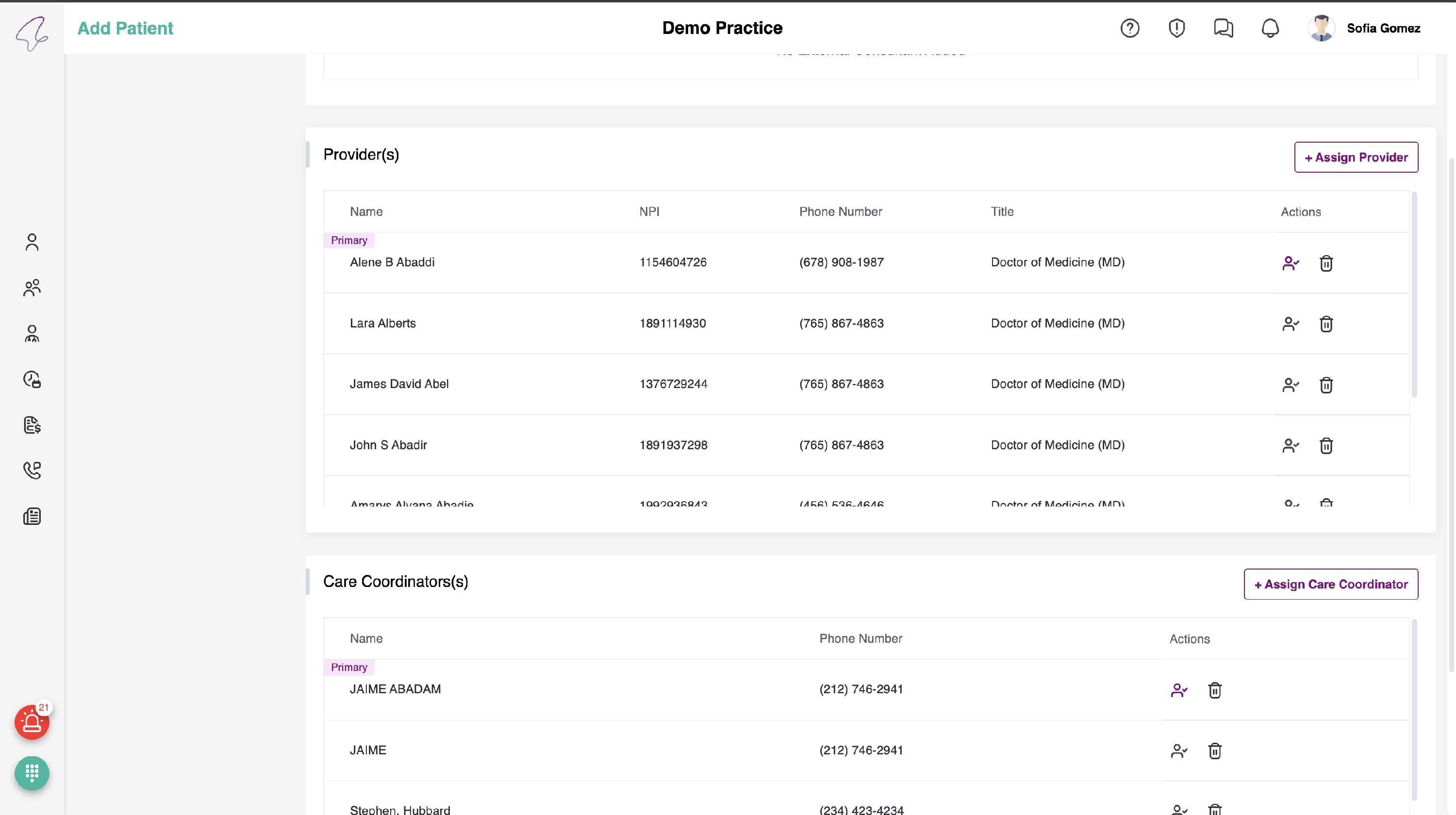 In order to assign a care coordinator , select the human avatar. Once it is selected, the icon colour will change to purple and you will see the label "primary" above the name of the provider in the table.