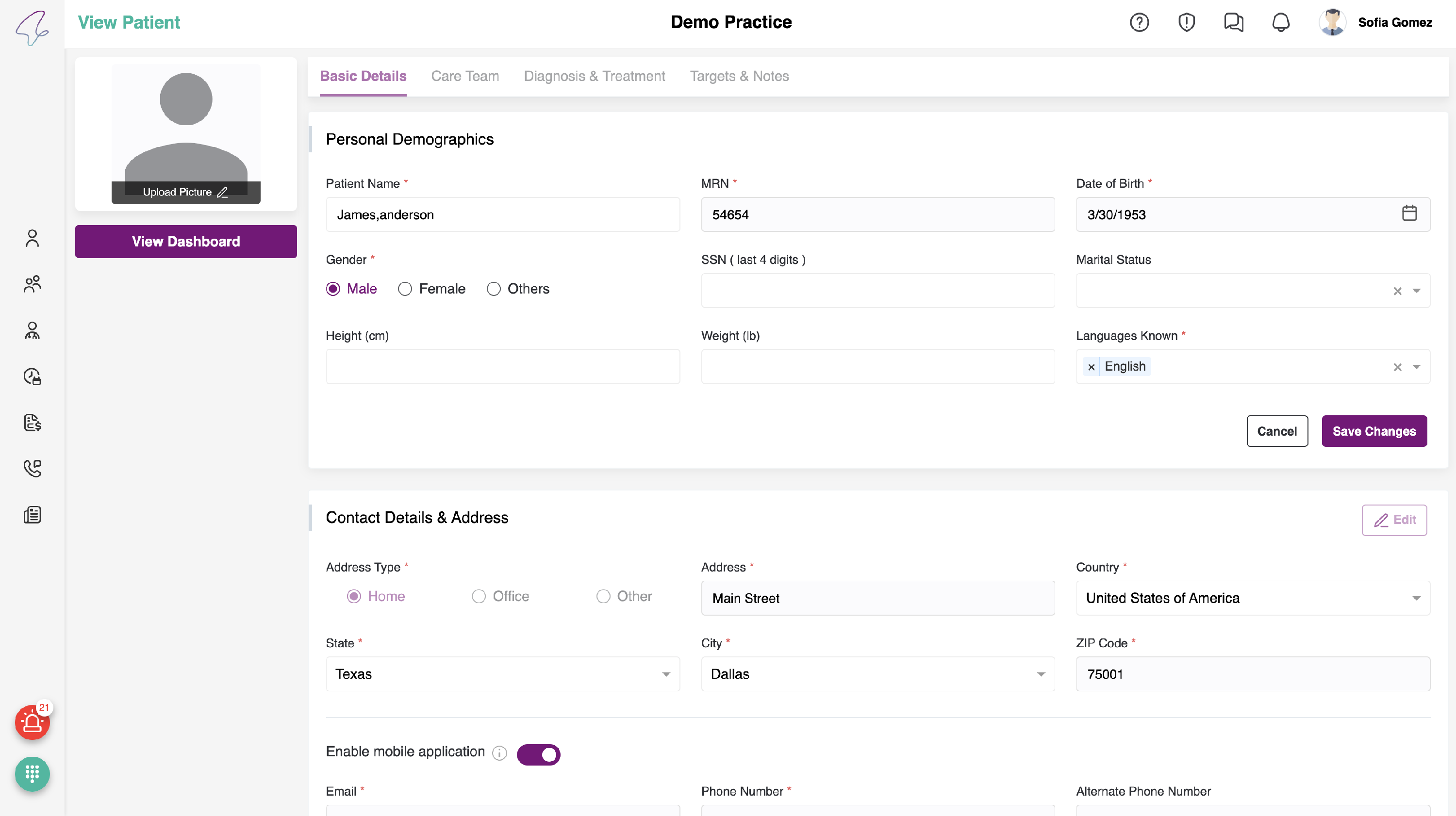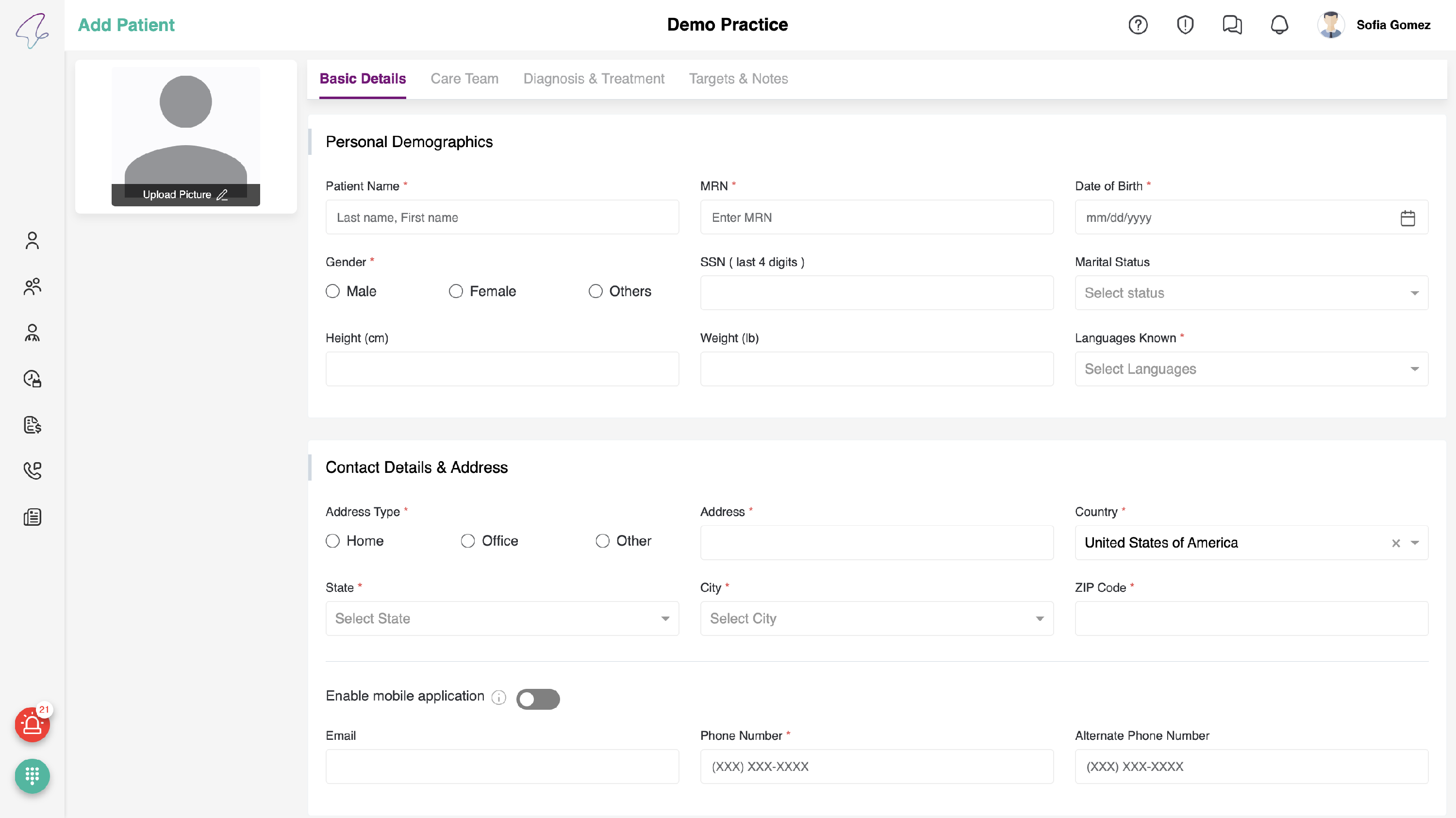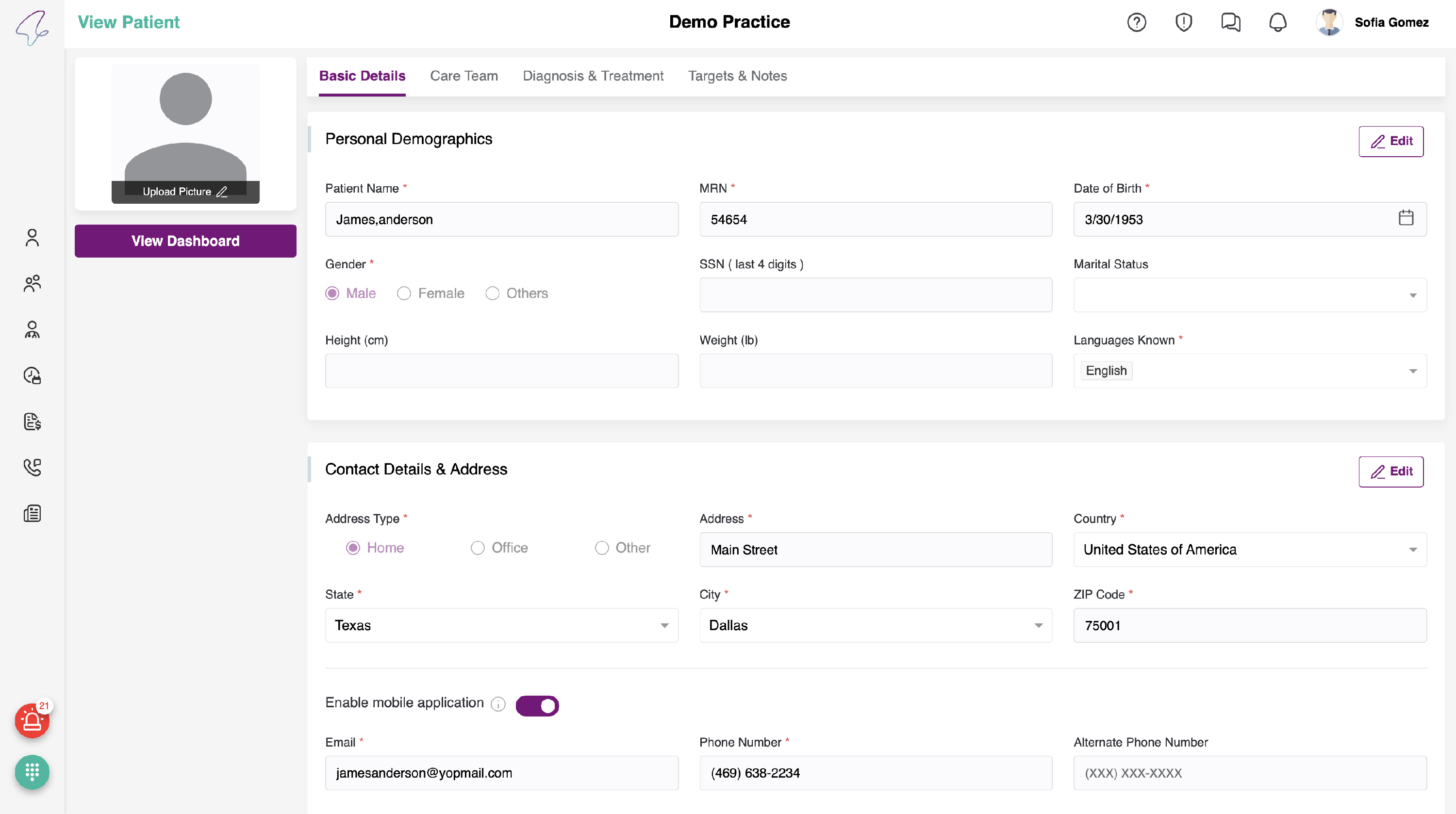 - Here, you can view a toggle for enabling the mobile application, i.e., if the patient wants to use the mobile application, the PC should enable the toggle for which the email is Mandatory.