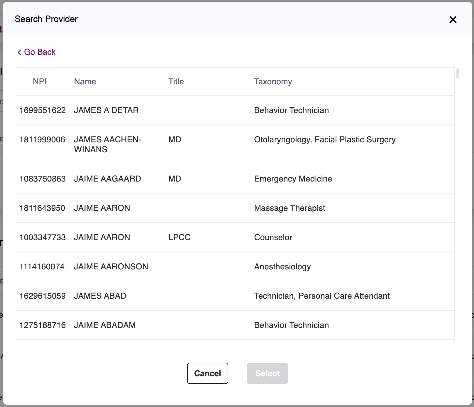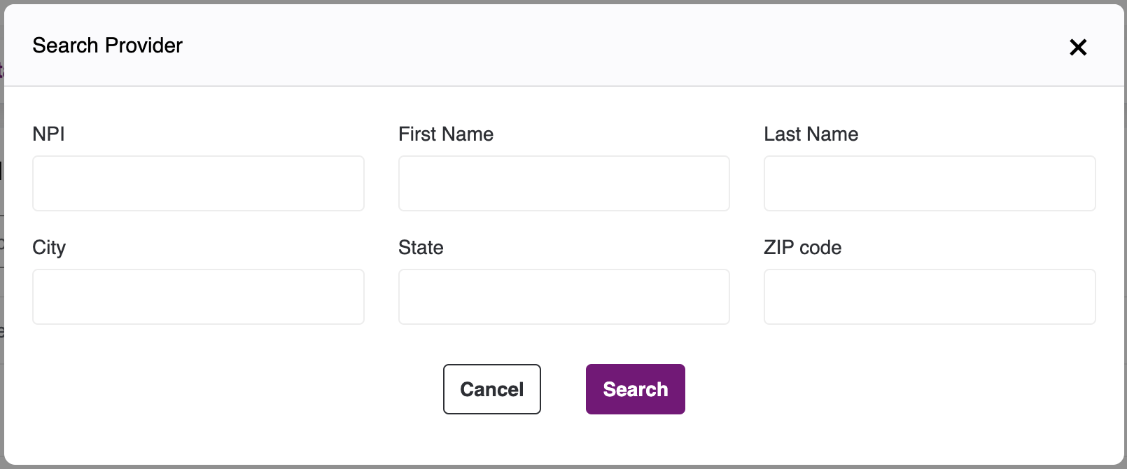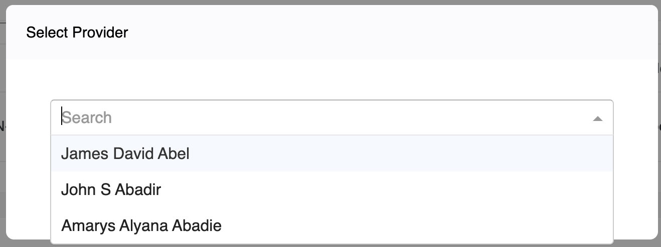 - You can search by NPI or any of the fields in the pop-up. Click on the Search Button, to see the list of provider matching your search criteria.