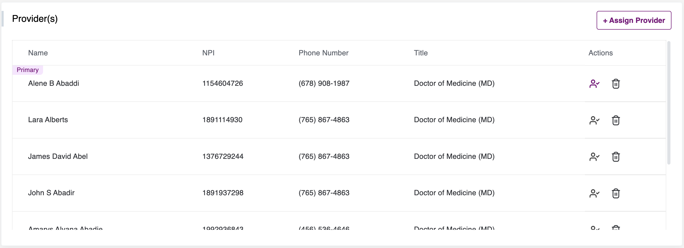 - In order to assign a Provider, select the human avatar. Once it is selected, the icon colour will change to purple and you will see the label "primary" above the name of the provider in the table.