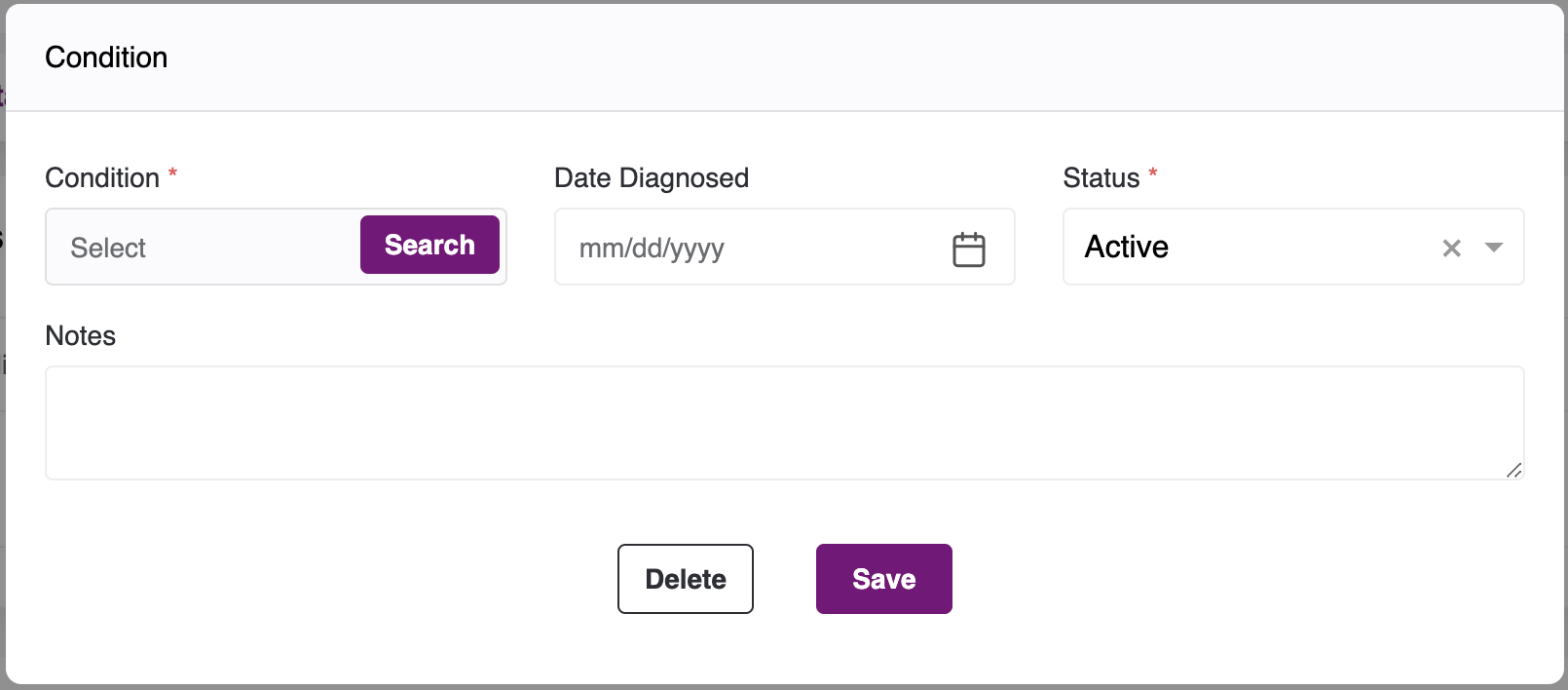 - When entering a diagnosis, please note that the condition name cannot be modified once it has been added. If you wish to make changes, you have the option to either add a new diagnosis condition or delete the undesired conditions.