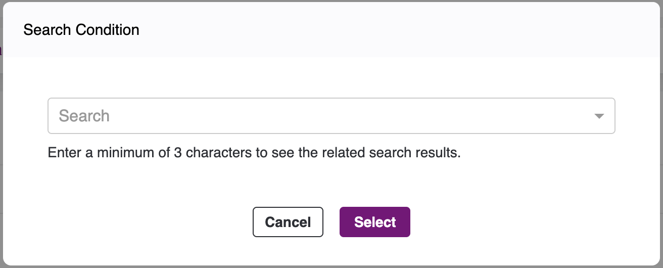 - Enter 3 characters to view the dropdown. Click the condition you want to add and click on the Select button. Click on the Save button, to add this Condition, else click on Delete button.