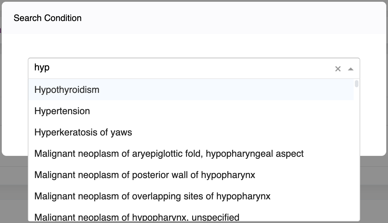 - In the Diagnosis section, click on Add Condition button, you will view a pop-up as follows: