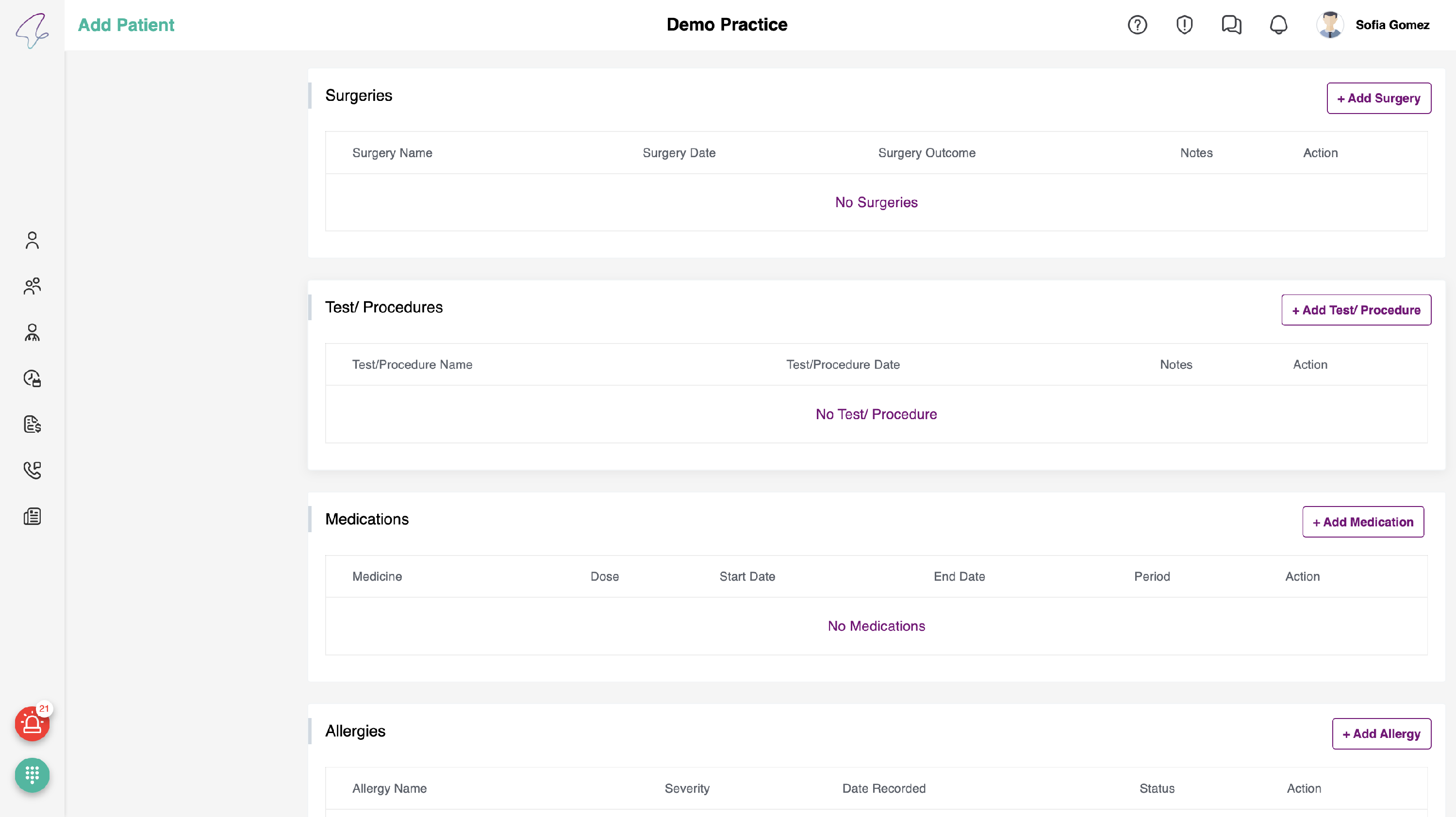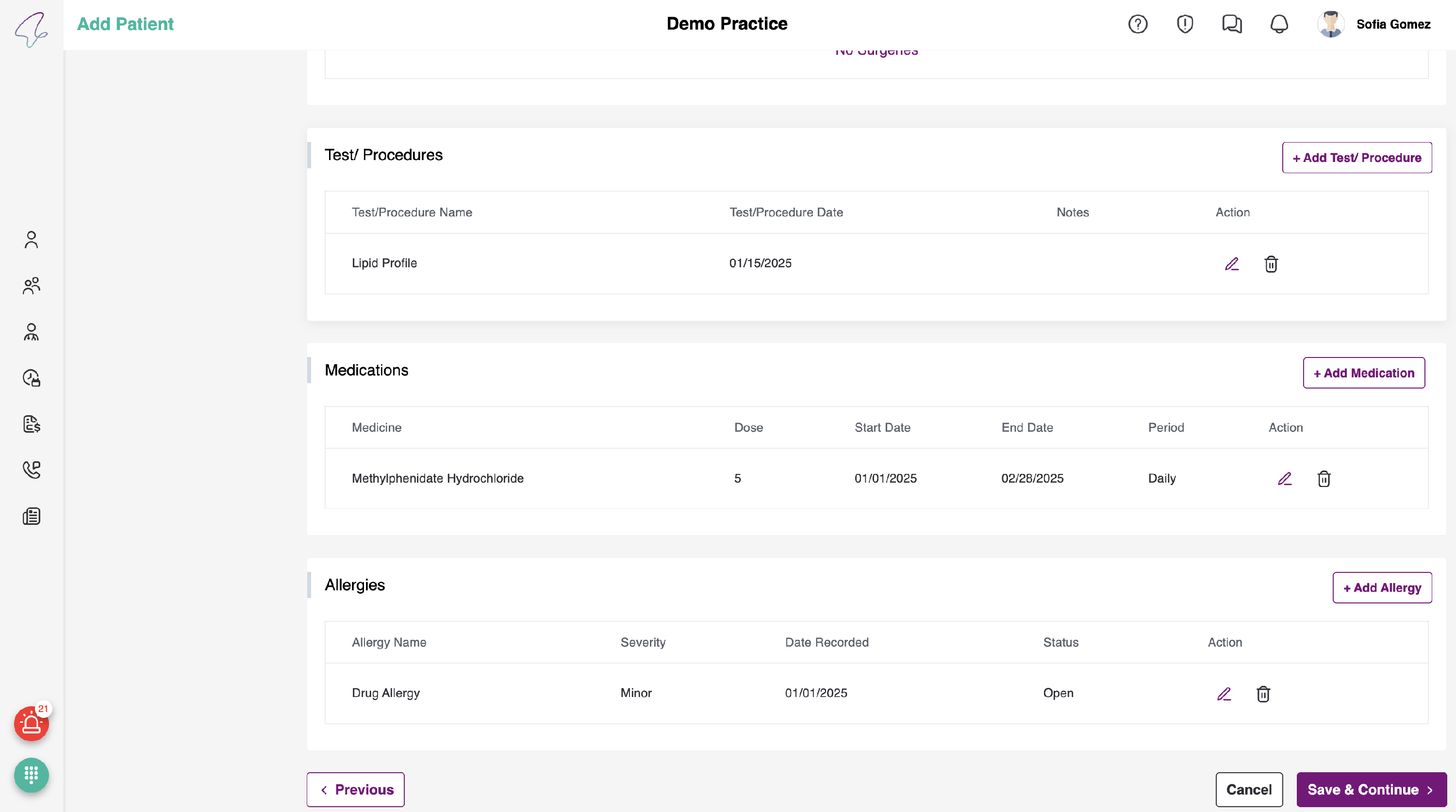 - To add Diagnosis, Surgeries, Test/ Procedures and Allergies Sections, you have to fill the details in the respective pop-ups.
