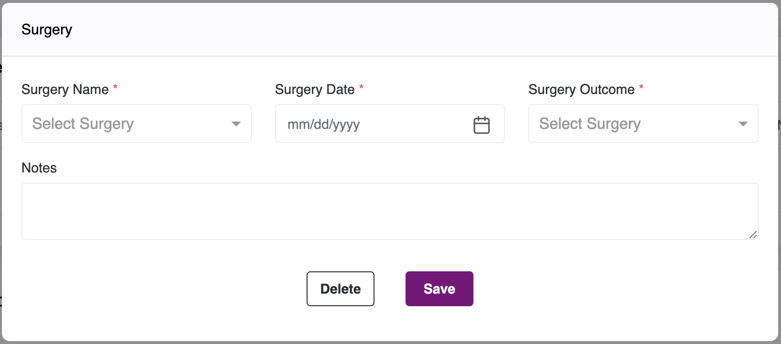 - The same with Surgeries and Test/Procedures, click on Add Surgery and Add Test/ Procedure Buttons.