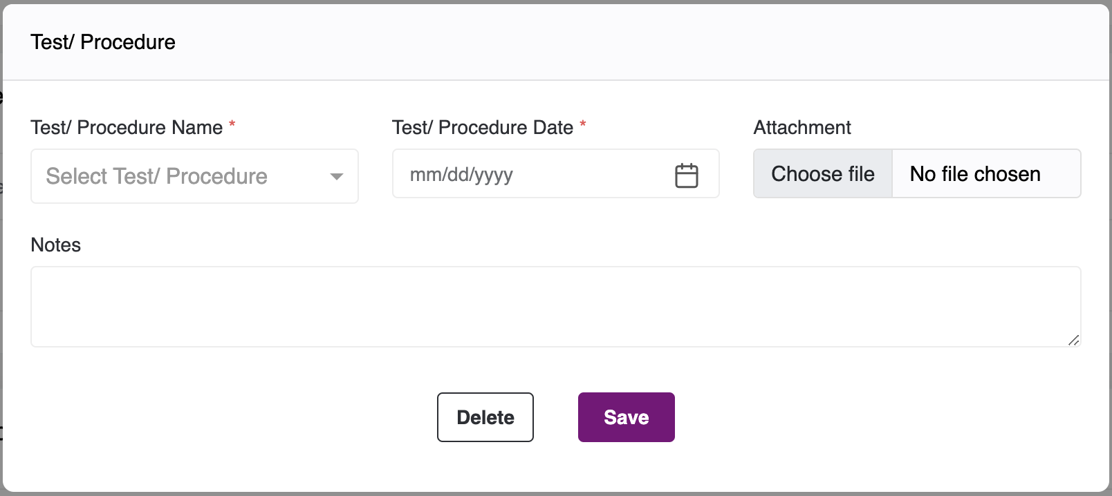 - In Test/ Procedure, you have an optional field - Attachment where can upload an attachment by clicking on Choose file button.