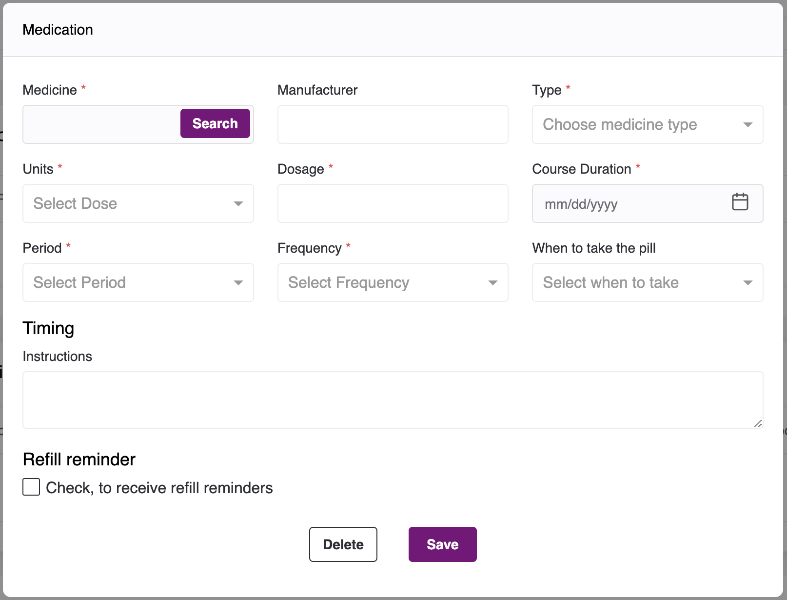 - All the medicine details will get auto-populated, fill the other details and click on the Save button to add this Medicine or click on Delete to cancel/delete this record.