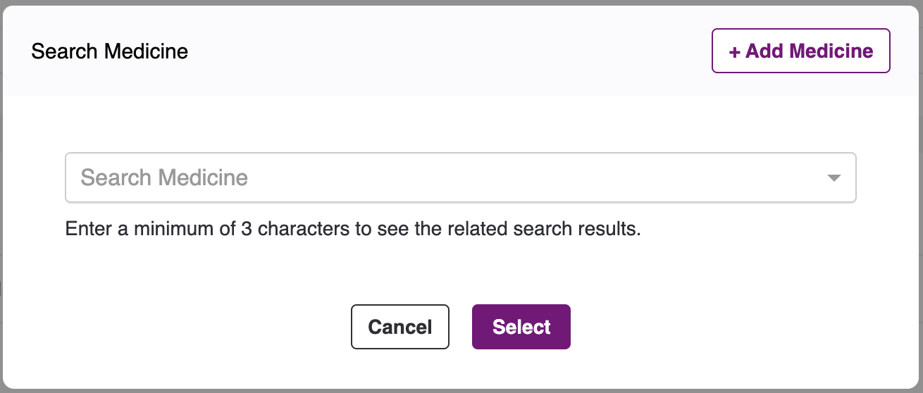 Search for medicine, to see the dropdown list. Select the medicine you want to add and click on the Select button. Medicine details will get populated in the respective fields.