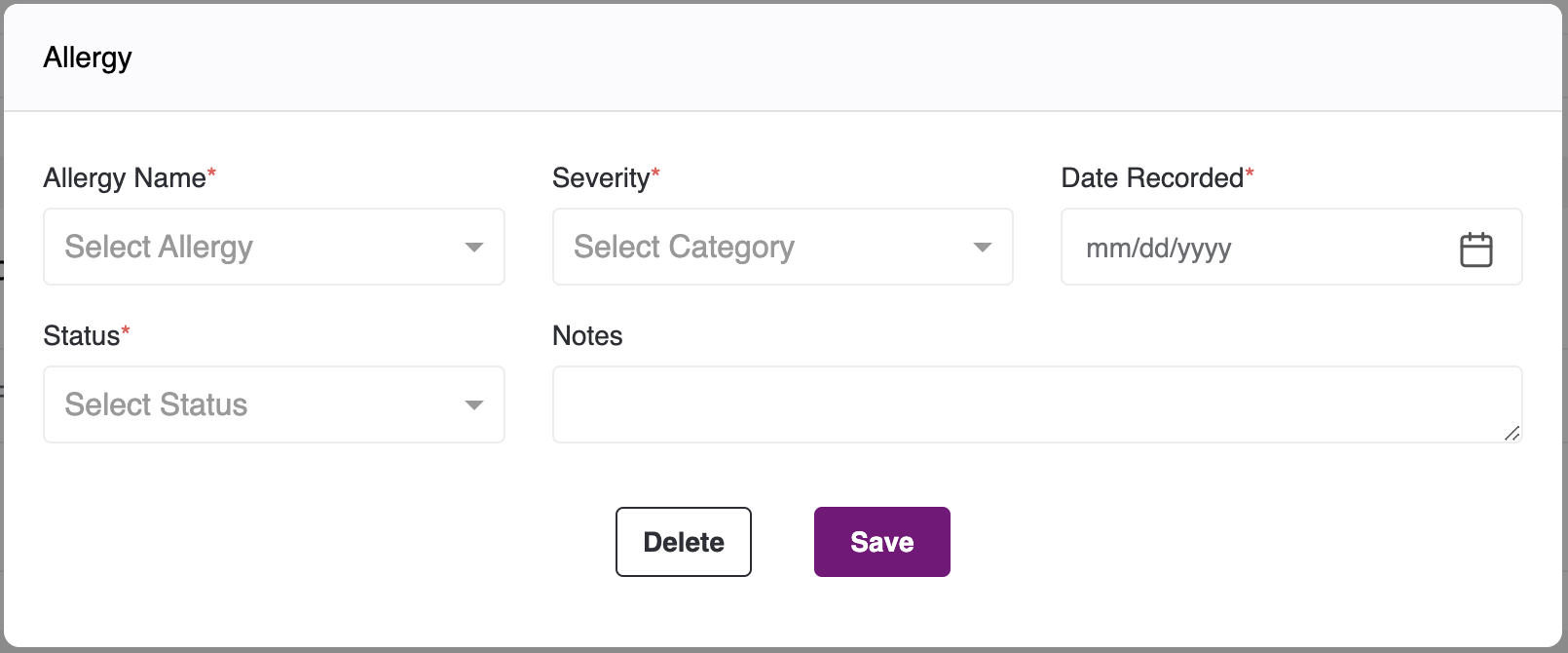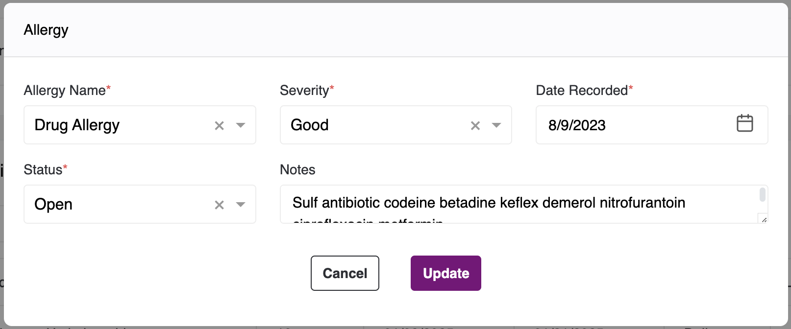 - To fill the Allergy Sections, click on the Add Allergy Button you will view the following pop-up: