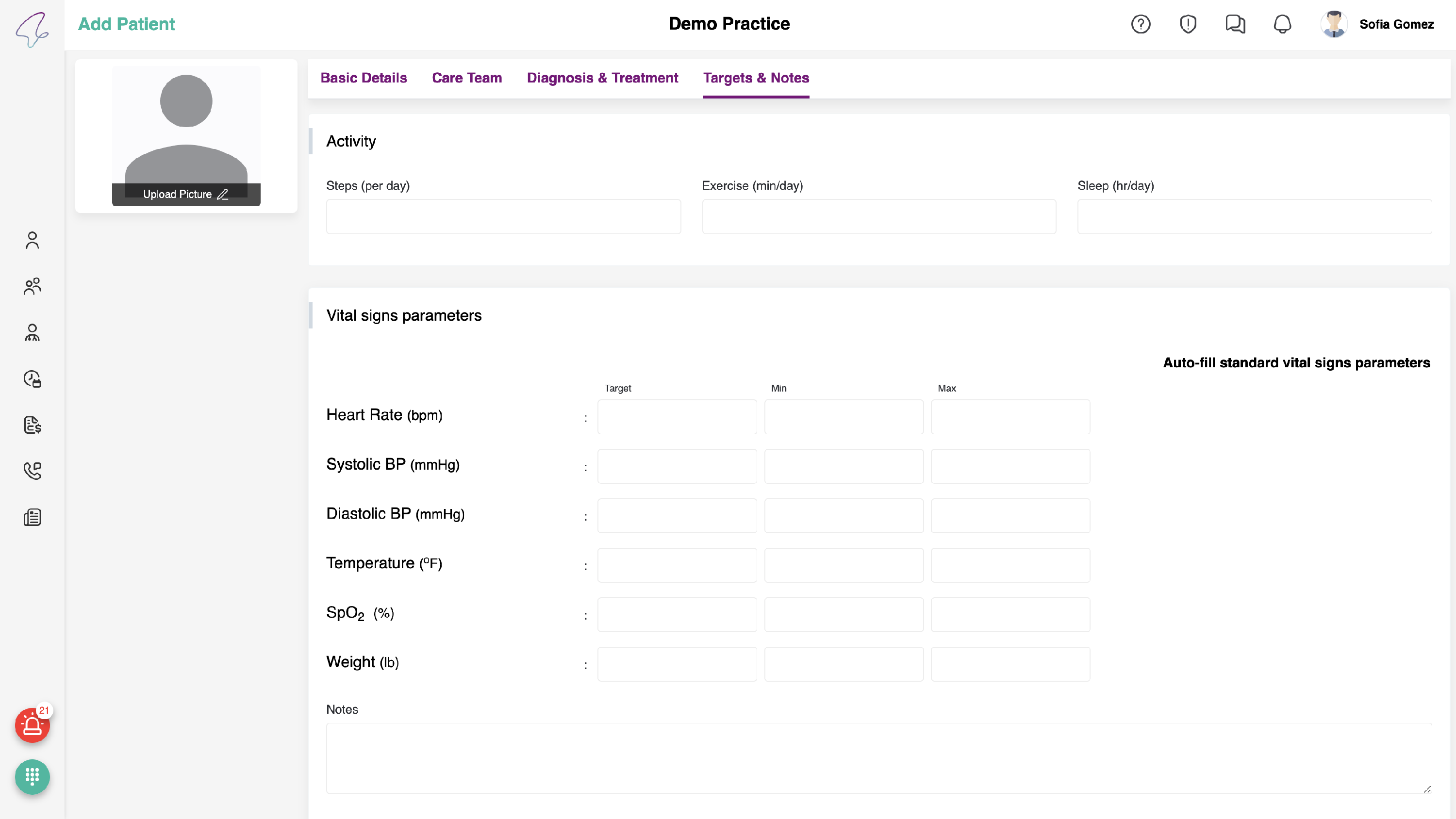- Fill the fields in Activity section. You can click on Auto-fill standard Vital signs parameters to populate the data other than weight, fill the details.