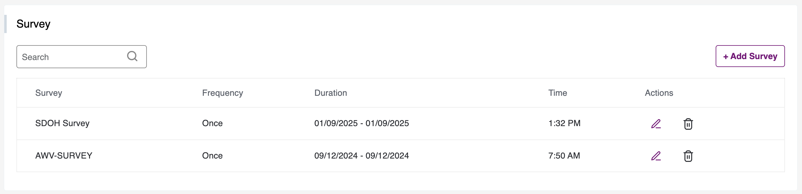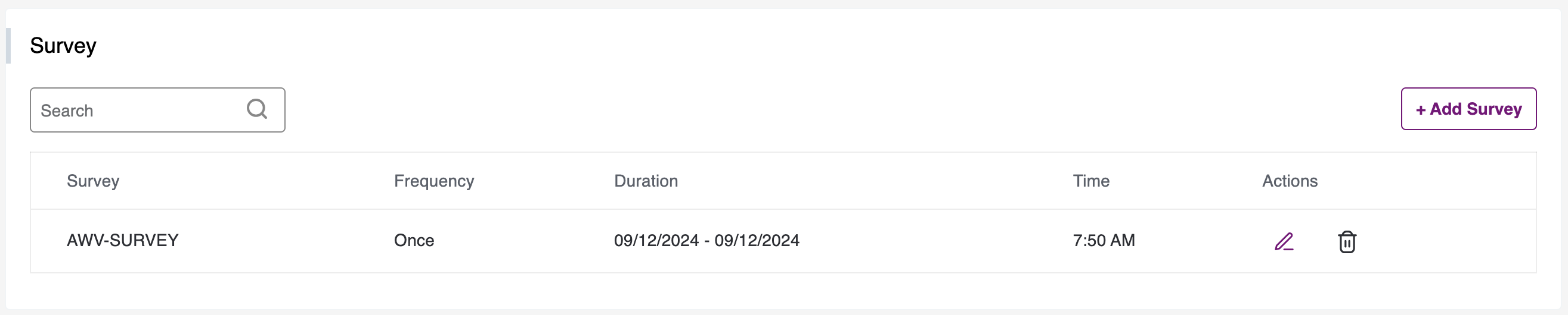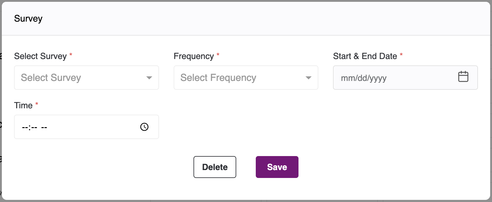 - You can add a New Survey, by clicking on the Add Survey button on the right, you will the following pop-up: