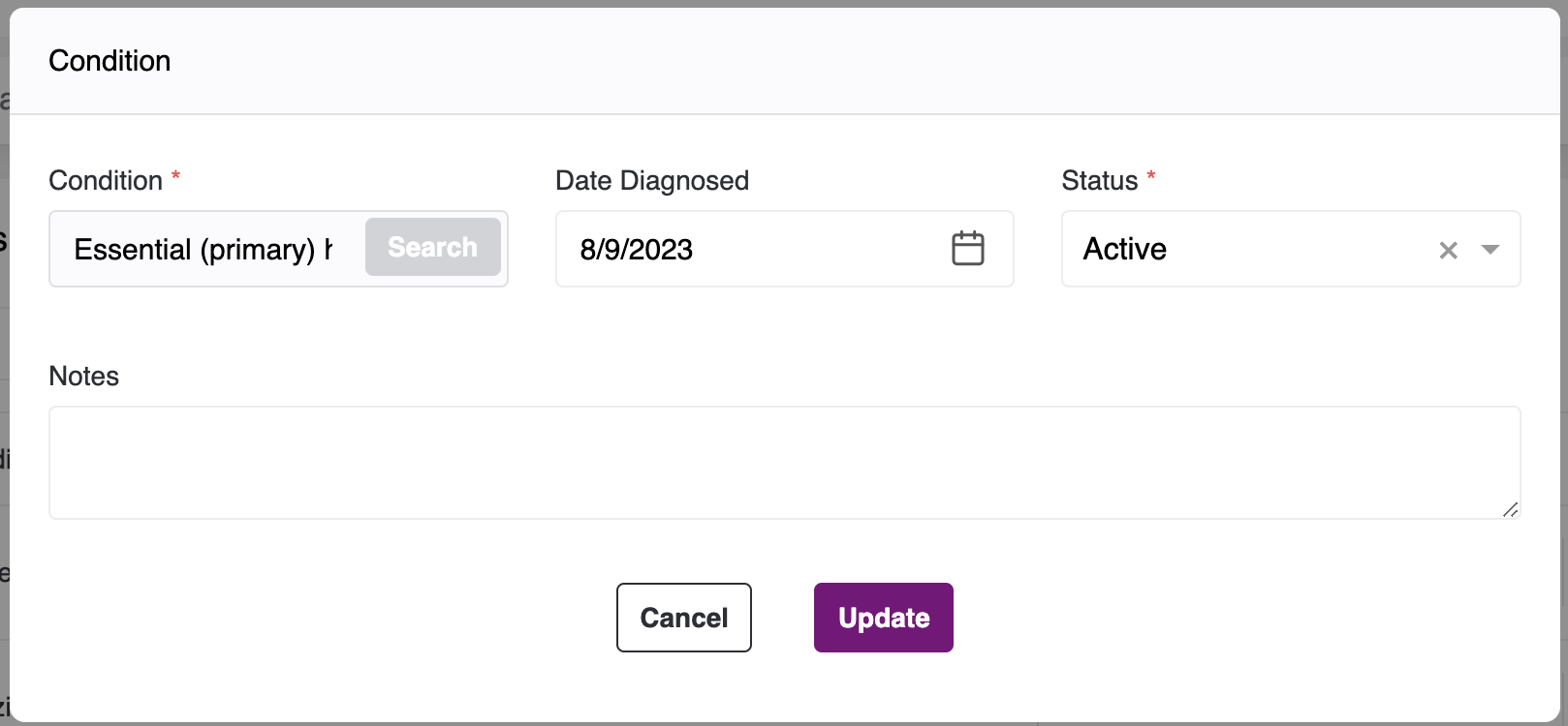 - To modify the Diagnosis & Treatment section, click on the edit icon. Upon clicking it, you will be presented with a pop-up containing pre-filled data.