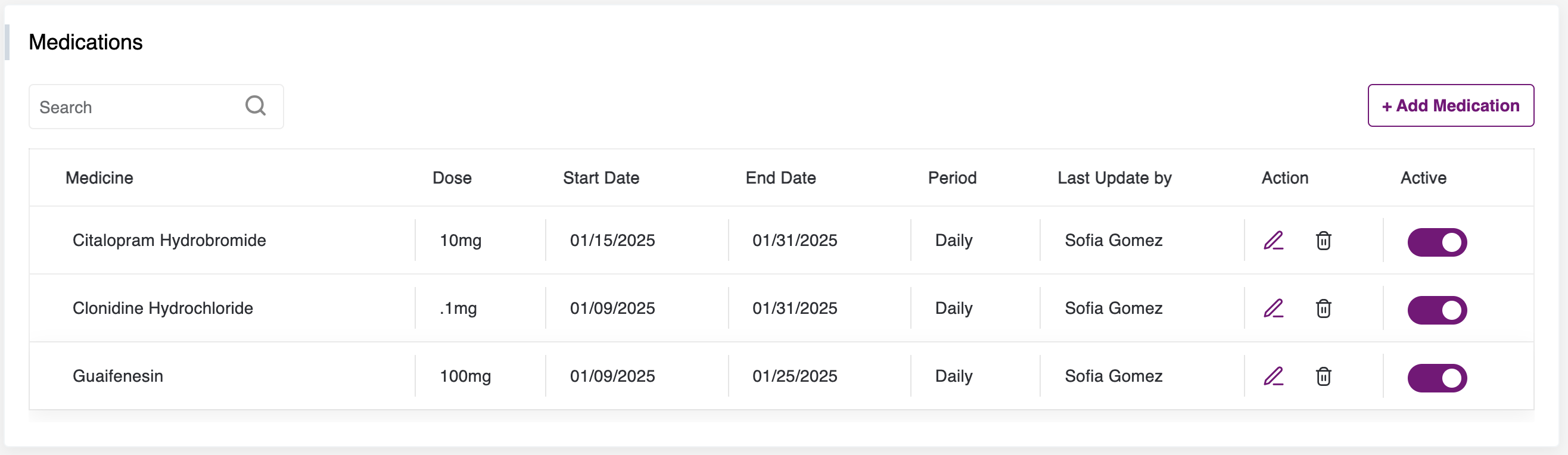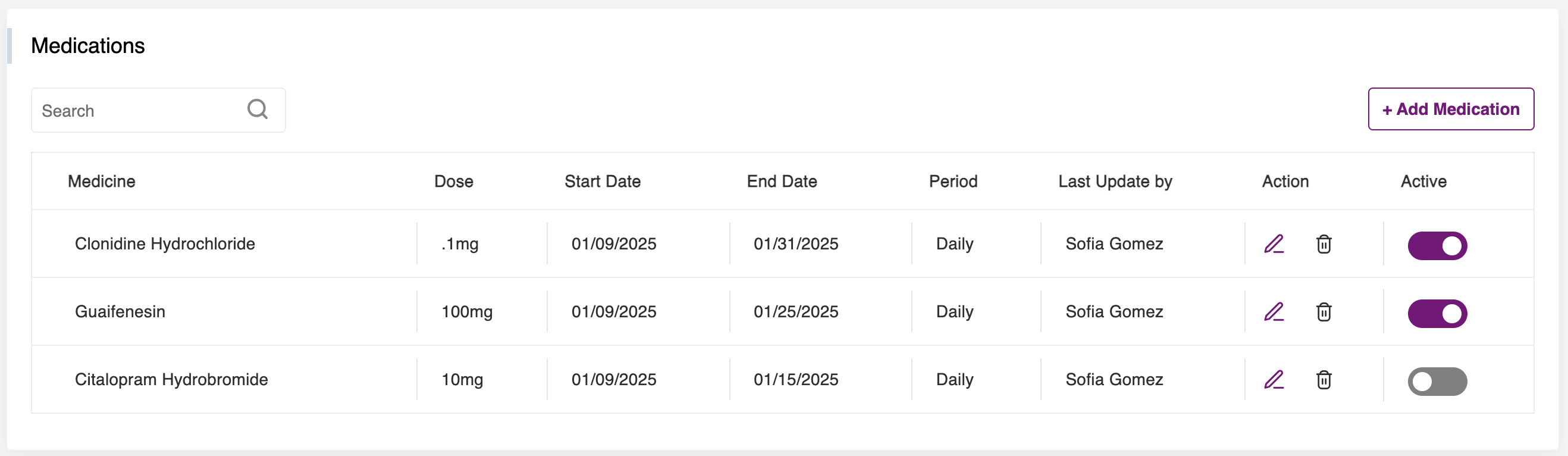 - Regarding the medications section, it is important to note that once a medicine name is added, it cannot be changed. If a change is necessary, a new medicine can be added, the unwanted medicine can be deleted, or it can be made inactive by clicking on the toggle button.