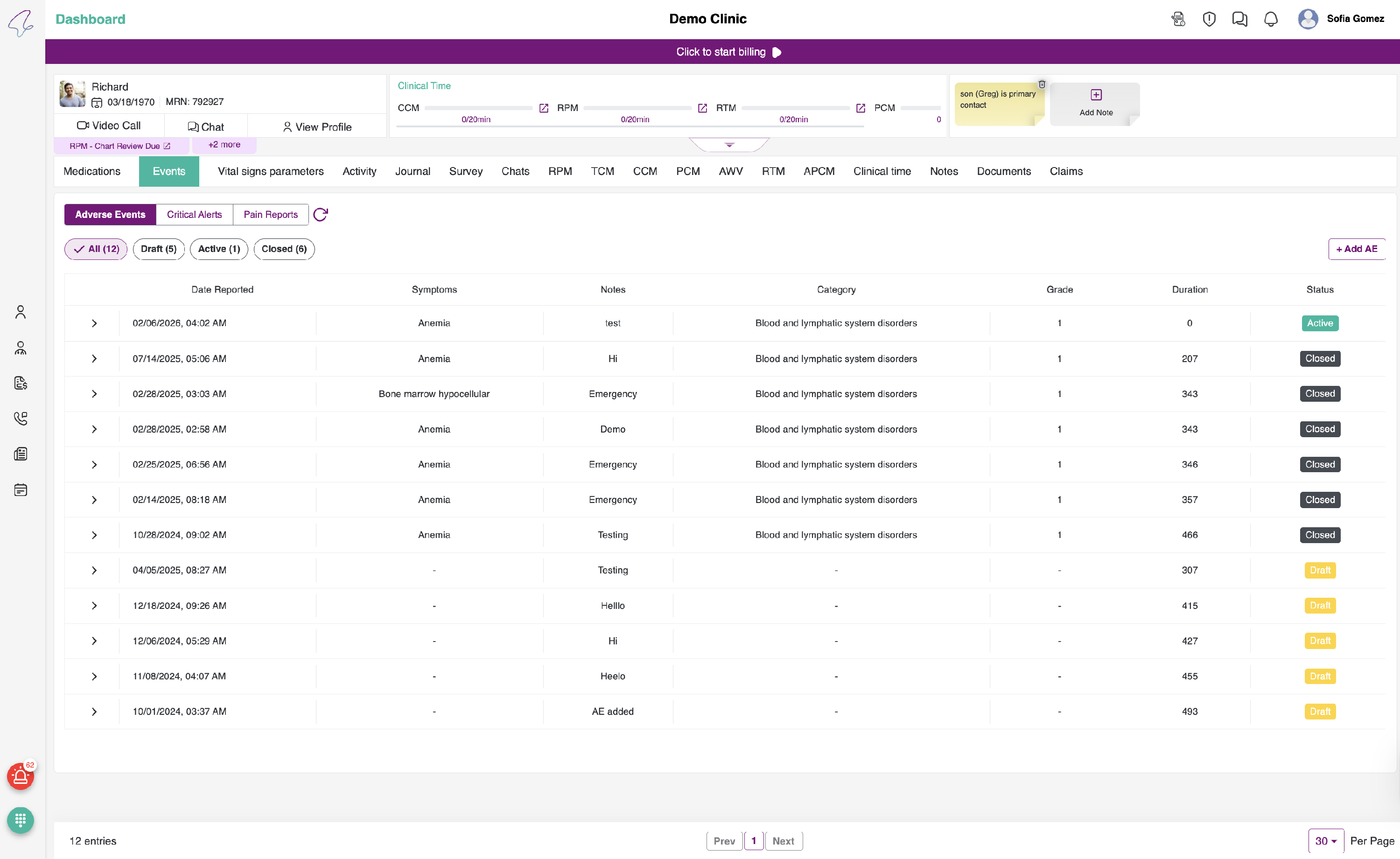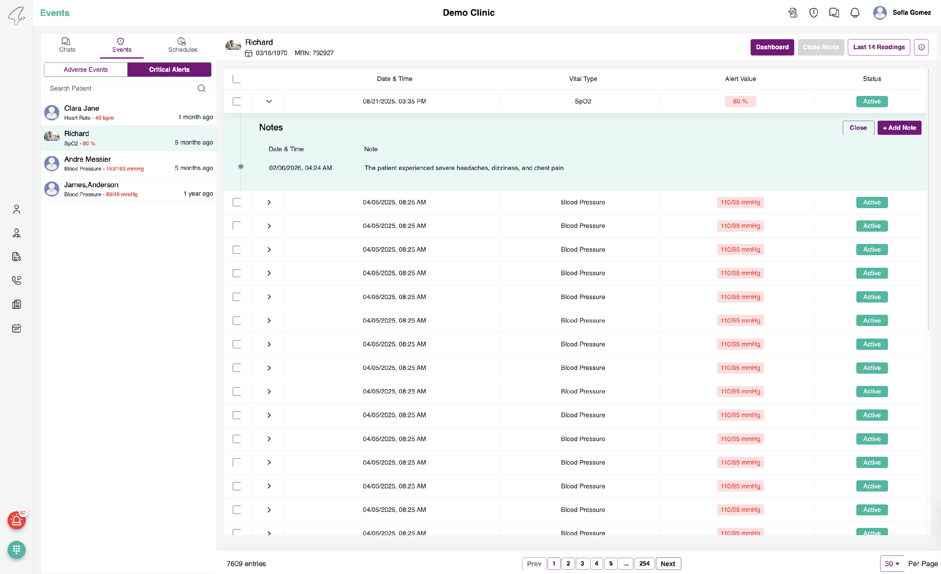 To view Critical Alerts, click on the Critical Alerts tab beside Adverse Events. The following page can be viewed: