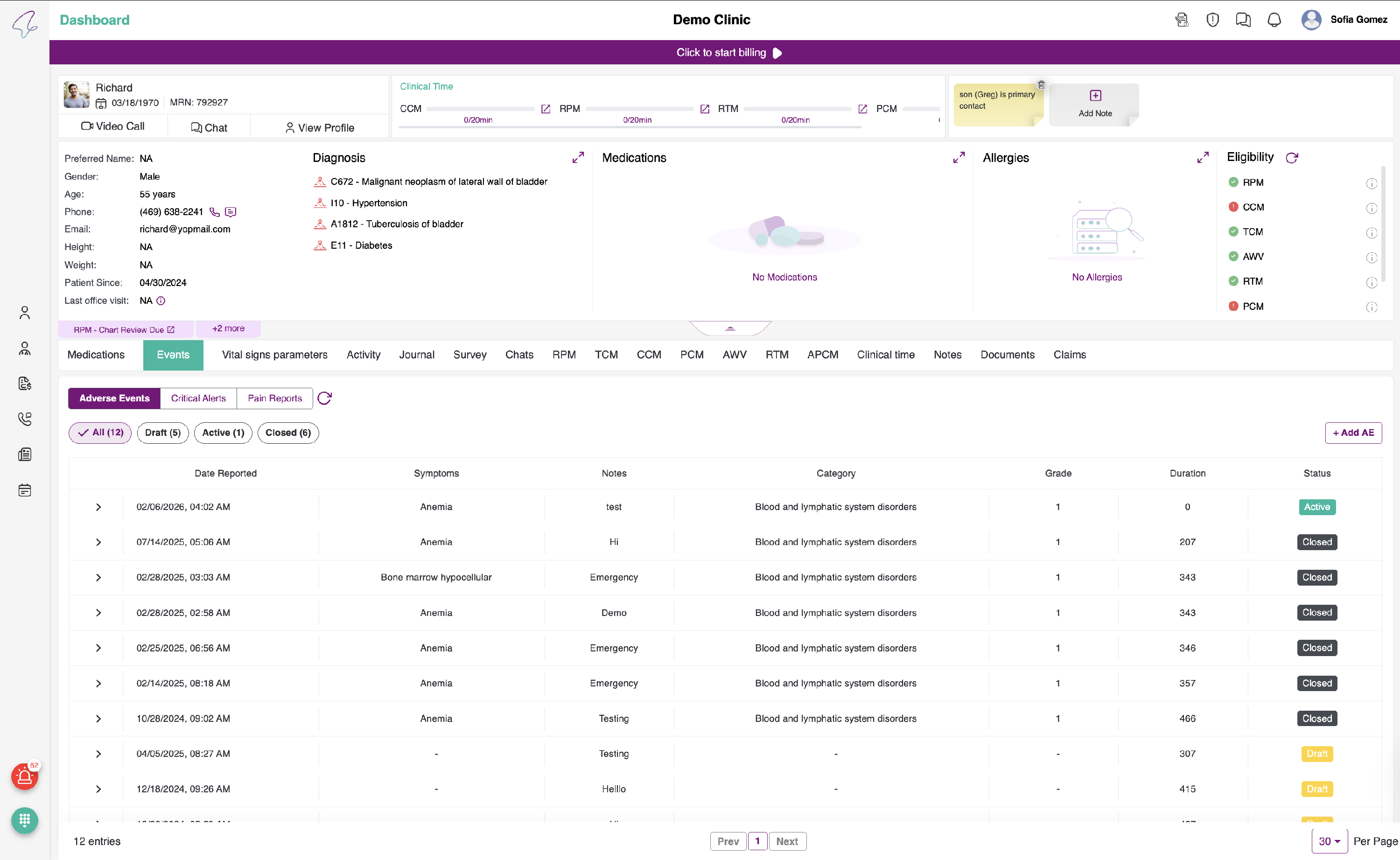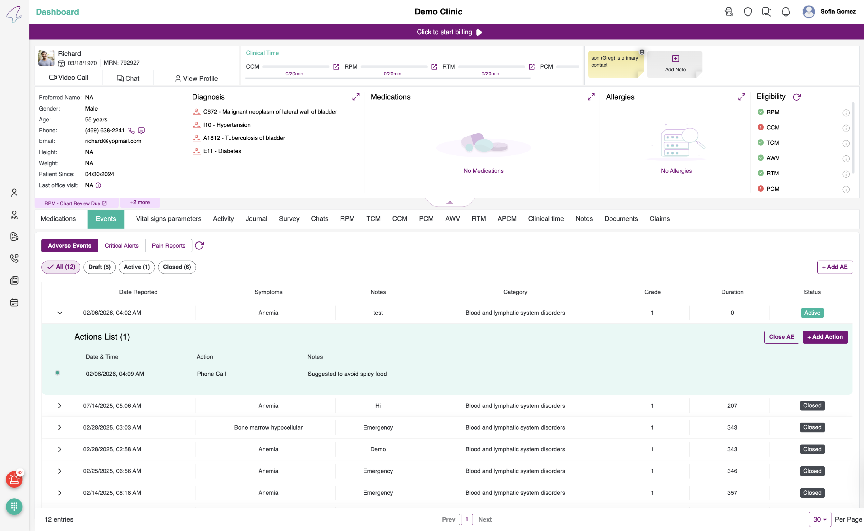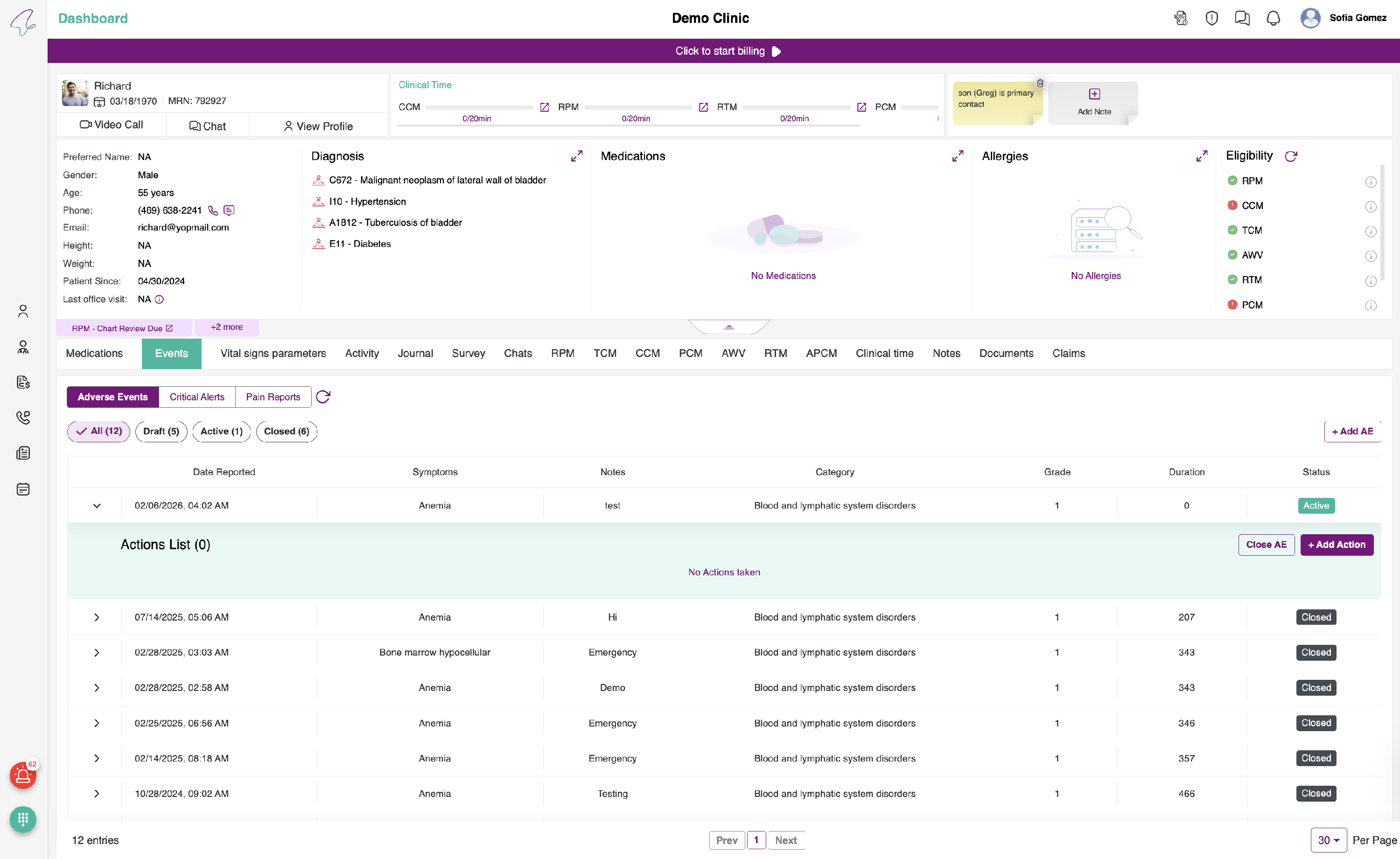 To view Events, click on the briefcase icon in the Patient's listing - Quick Actions.