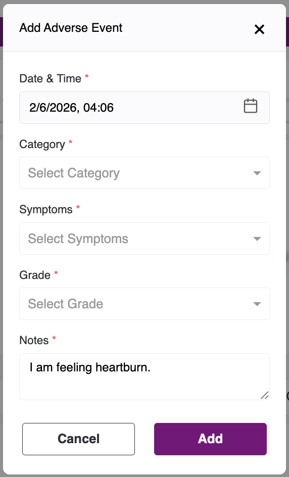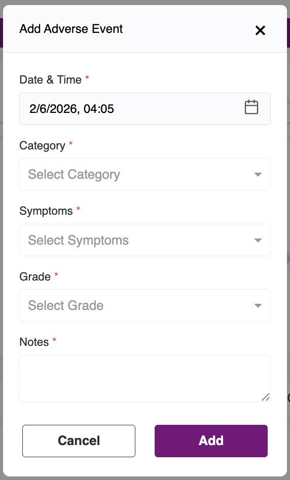 The pop-up has the following fields - Date & Time, Category, Symptoms, Grade, and Notes. Date will be auto-populated to the current date. After filling other fields, click on Add Button to Add Adverse Event, to cancel the AE click on Cancel Button.