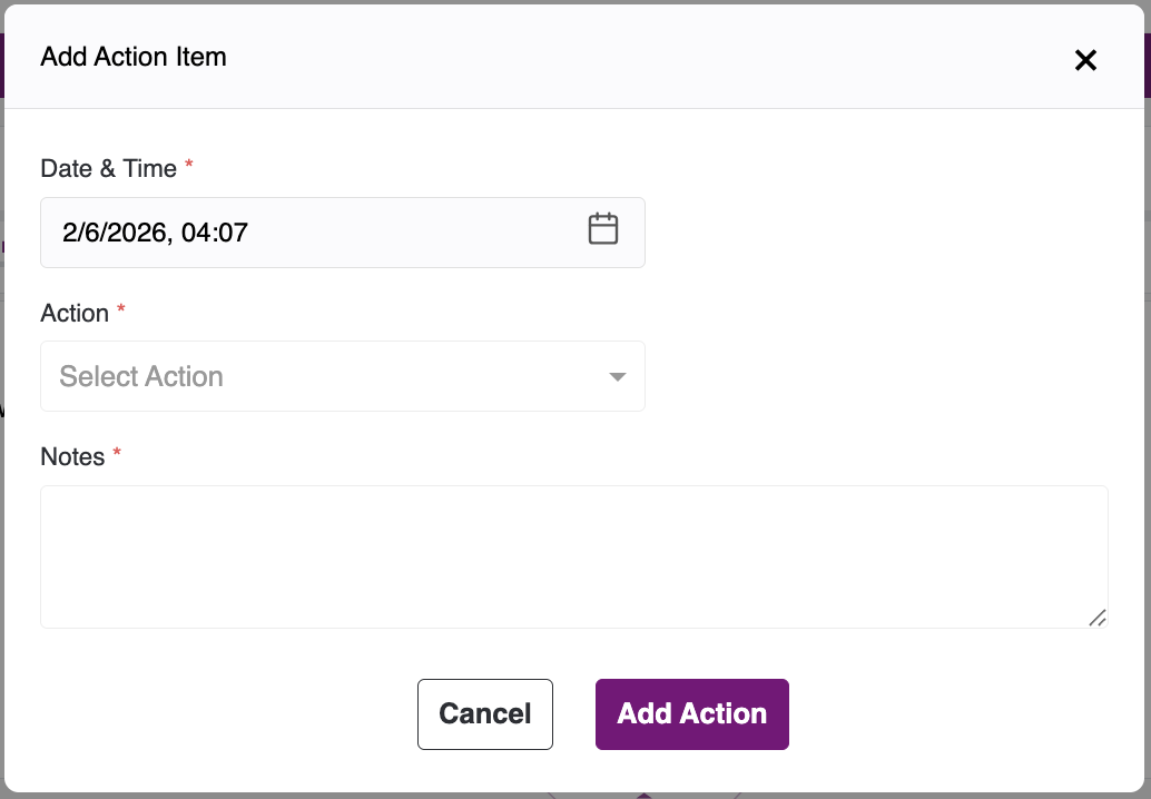 - The dialog has the fields - Date & Time, Action, and Notes.