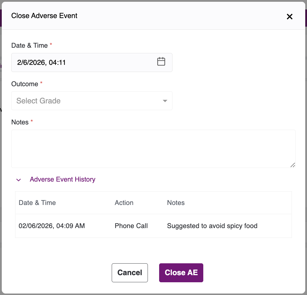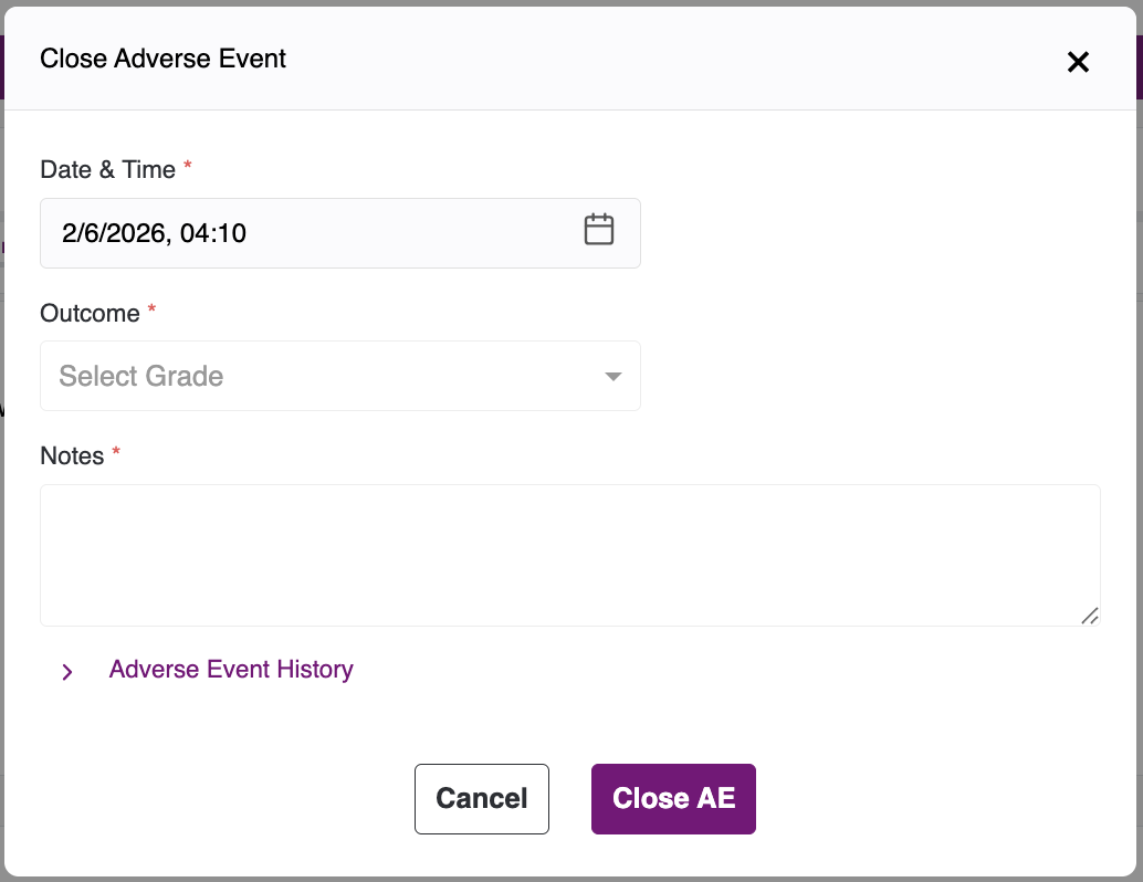 - Close Adverse Event has the following fields - Date & Time, Outcome, Notes and Adverse Event Details.