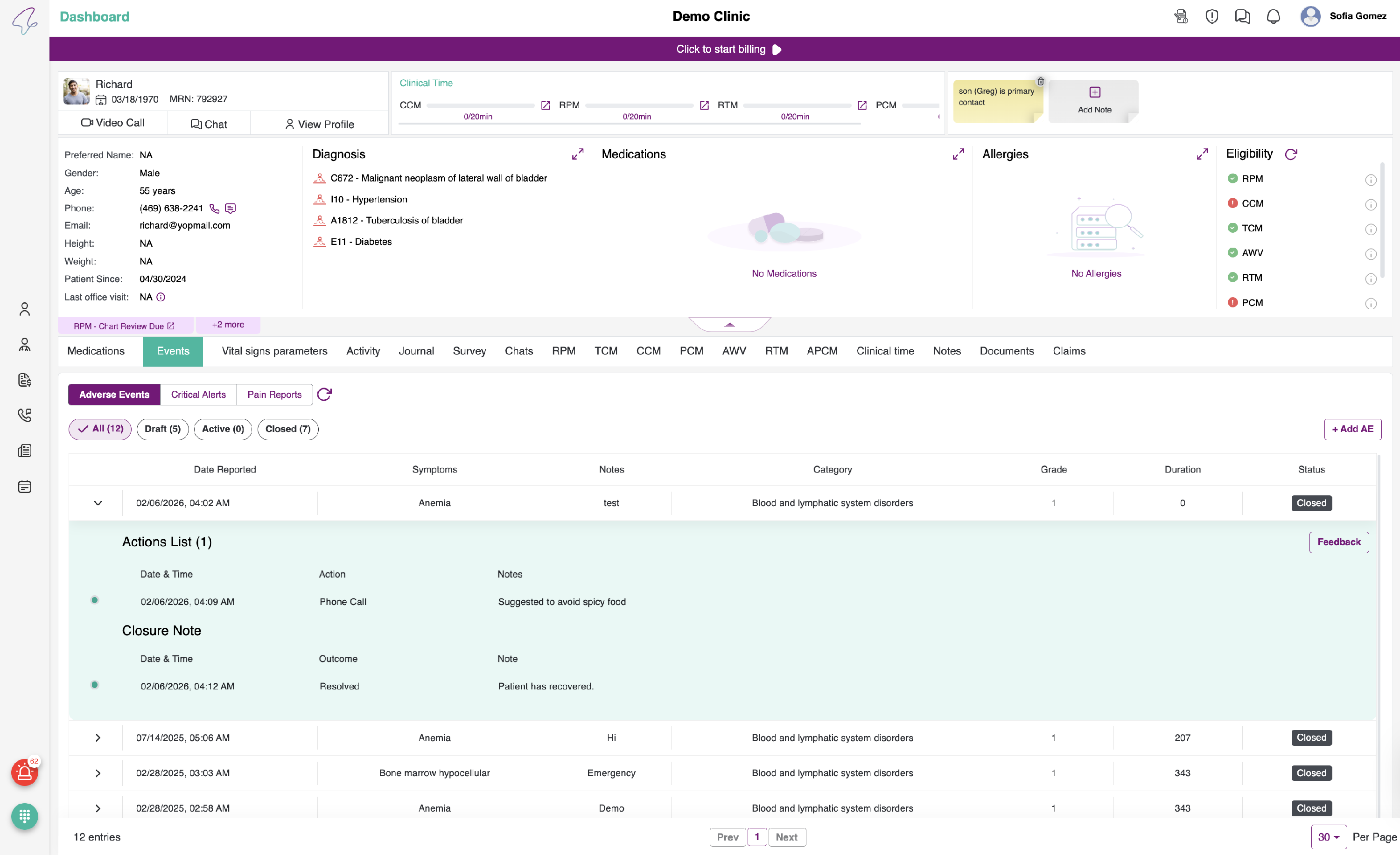 - Closed - Once the Adverse Event is resolved/ Drug is discontinued / when Prescription is added, it can be closed.