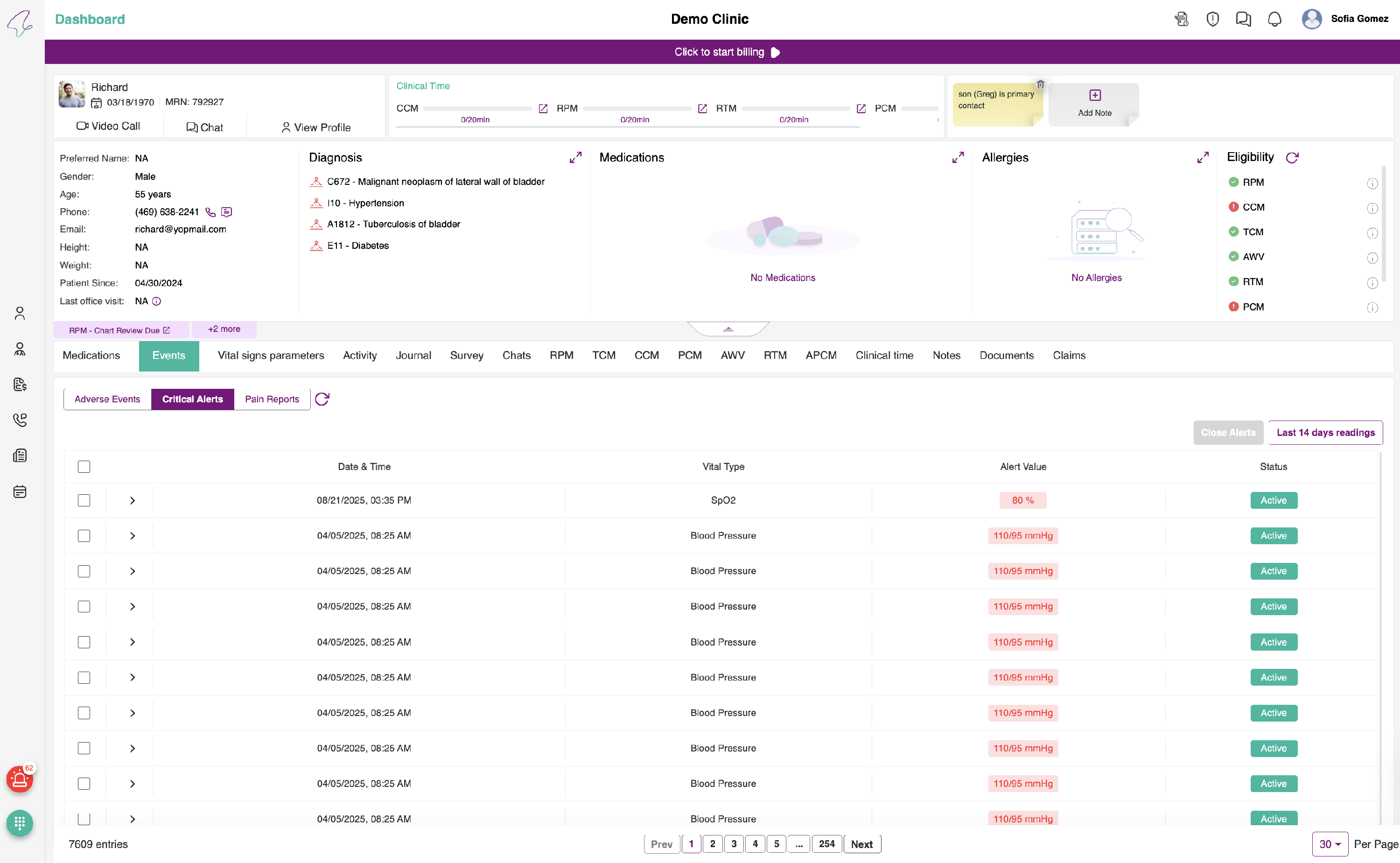 - So, whenever a patient takes the readings, those readings will be compared with the Min and Max values and if the value is not in range then the Critical Alert is raised and can bee viewed here.