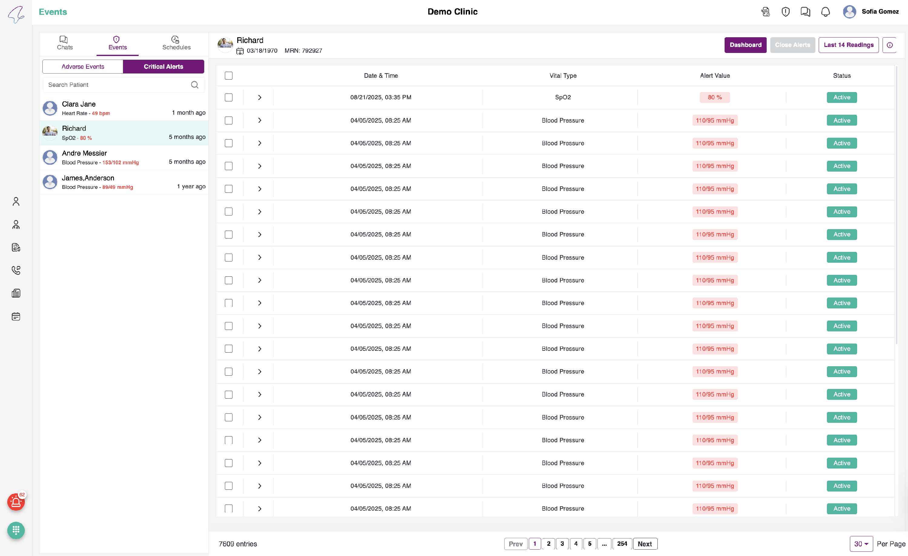 - We can view the last 14 days' readings of the patient by clicking on the "Last 14 Readings" link located above the table.