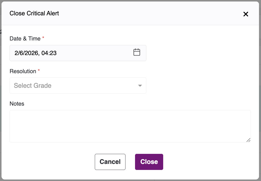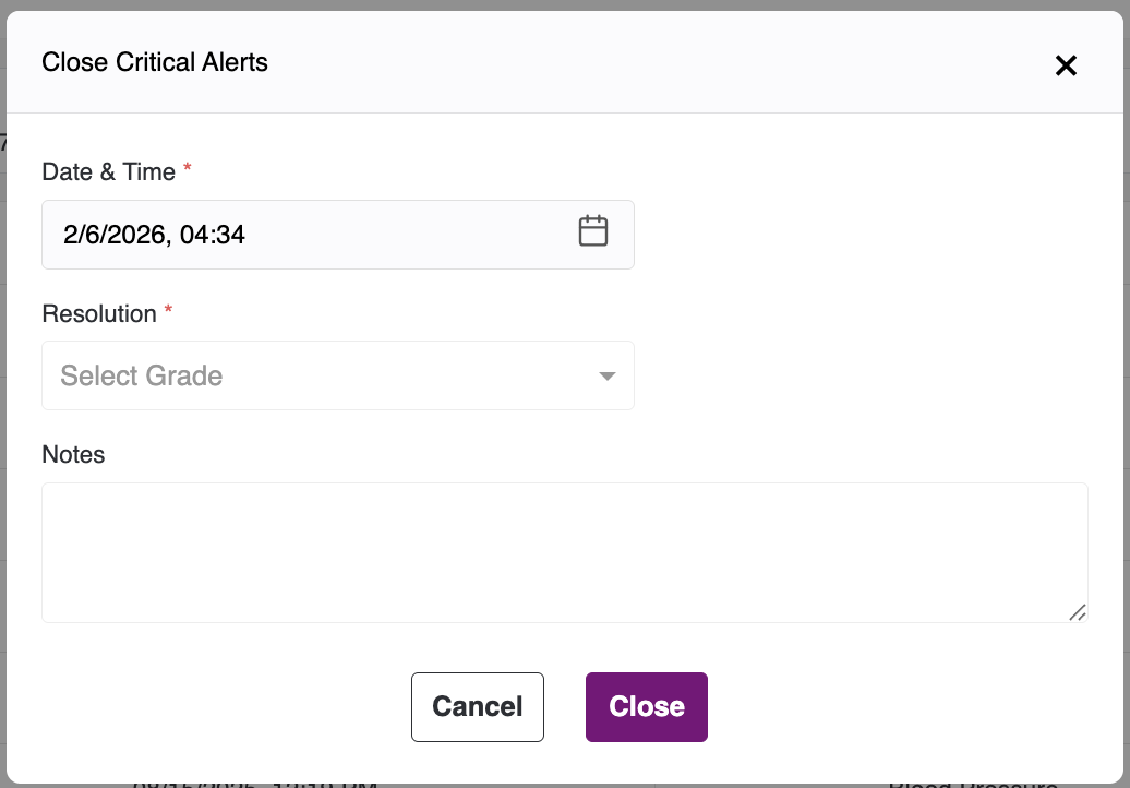 Upon clicking this button, a popup will appear. Fill in the mandatory fields and click Close. The selected alerts will be marked as closed and moved to the end of the list. For each alert closed, two minutes of clinical time will be added, and a corresponding note will be recorded in the main notes section on the patient dashboard.