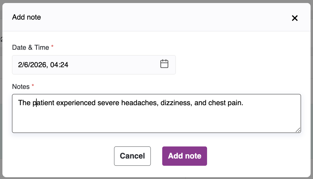 Add Notes: Use this option to add notes specific to the selected alert. These notes will remain associated only with this critical alert and will not appear in the patient’s main notes or on the patient dashboard.