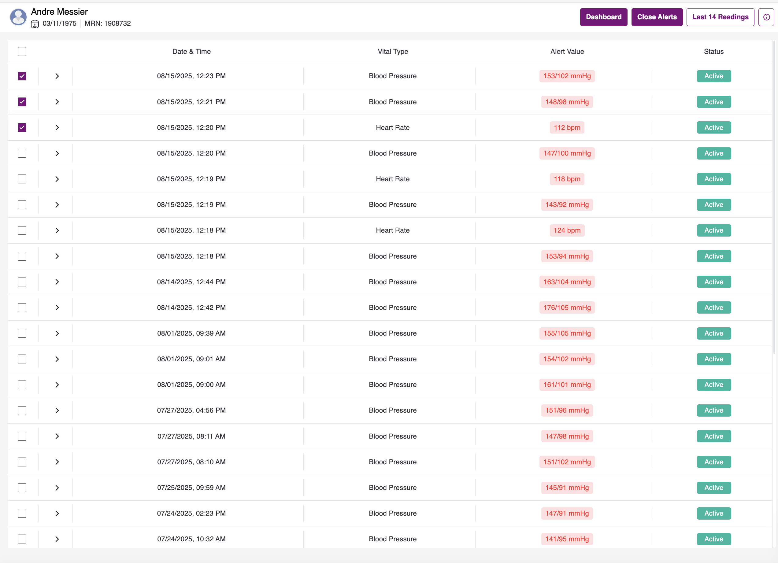 To close multiple alerts at once, select the checkboxes for the critical alerts you want to close. Then click the Close Alerts button located beside the Last 14 Readings button in the top-right corner.