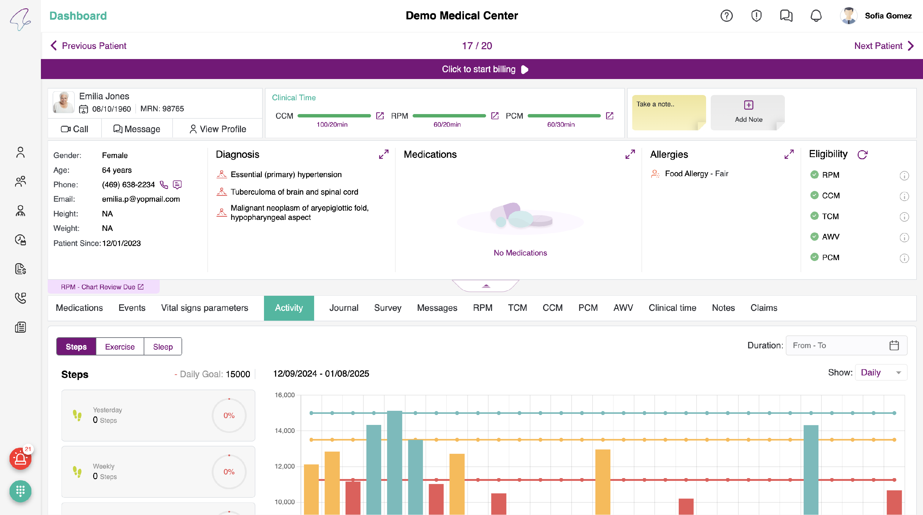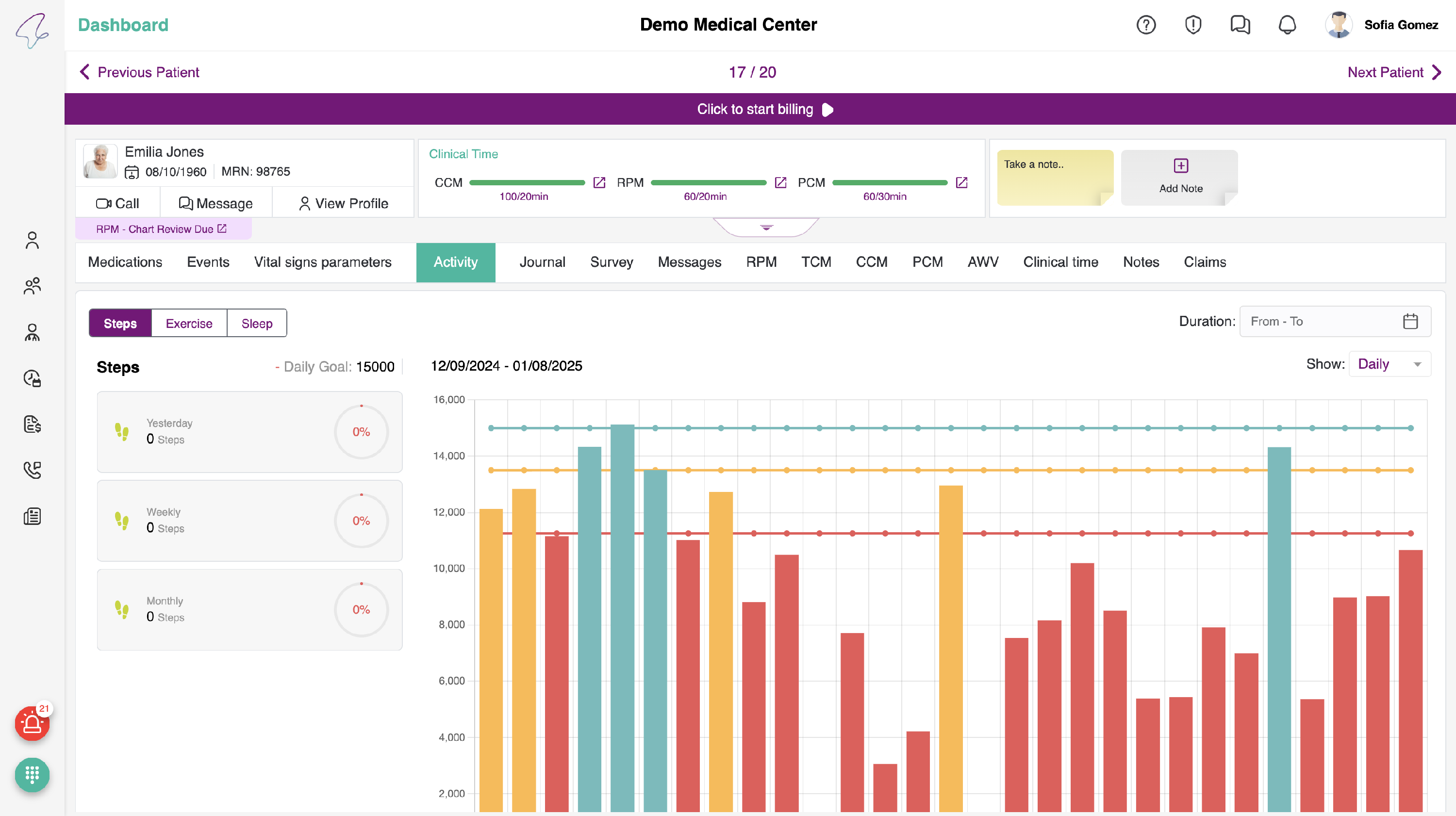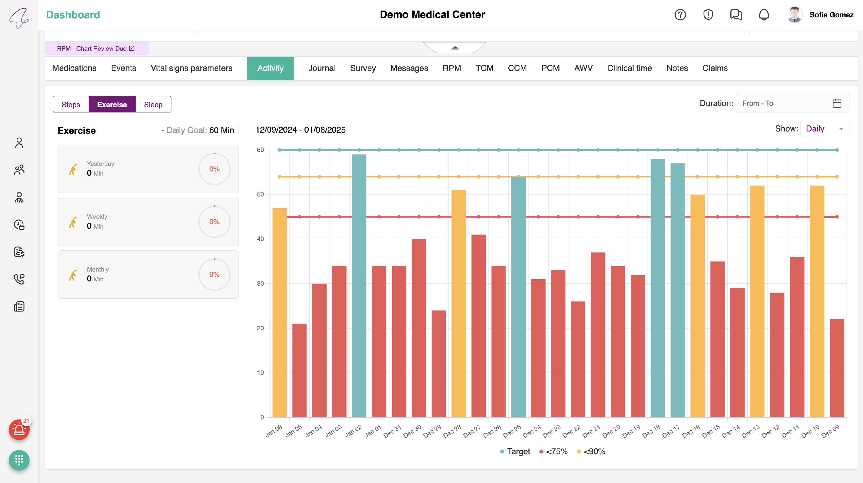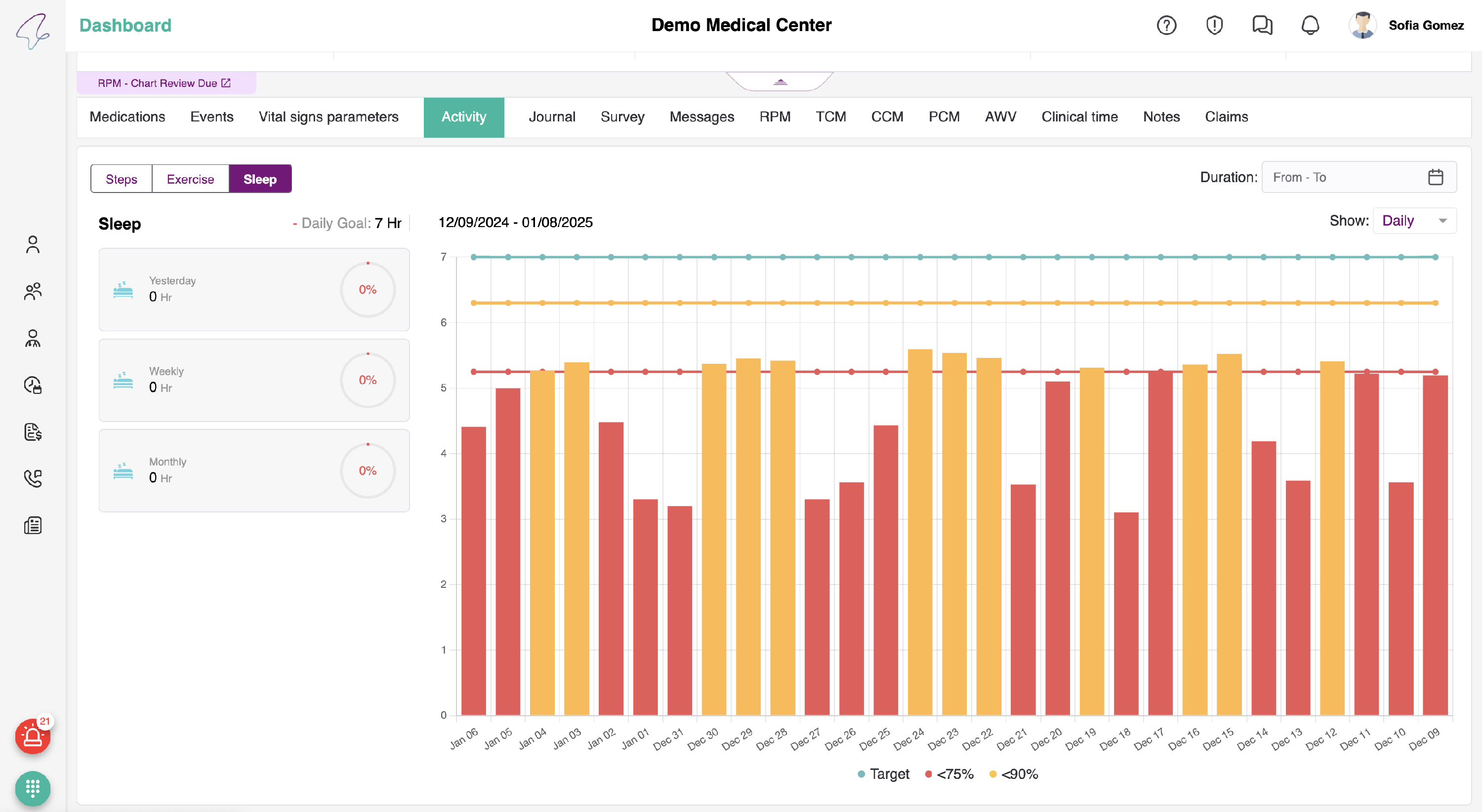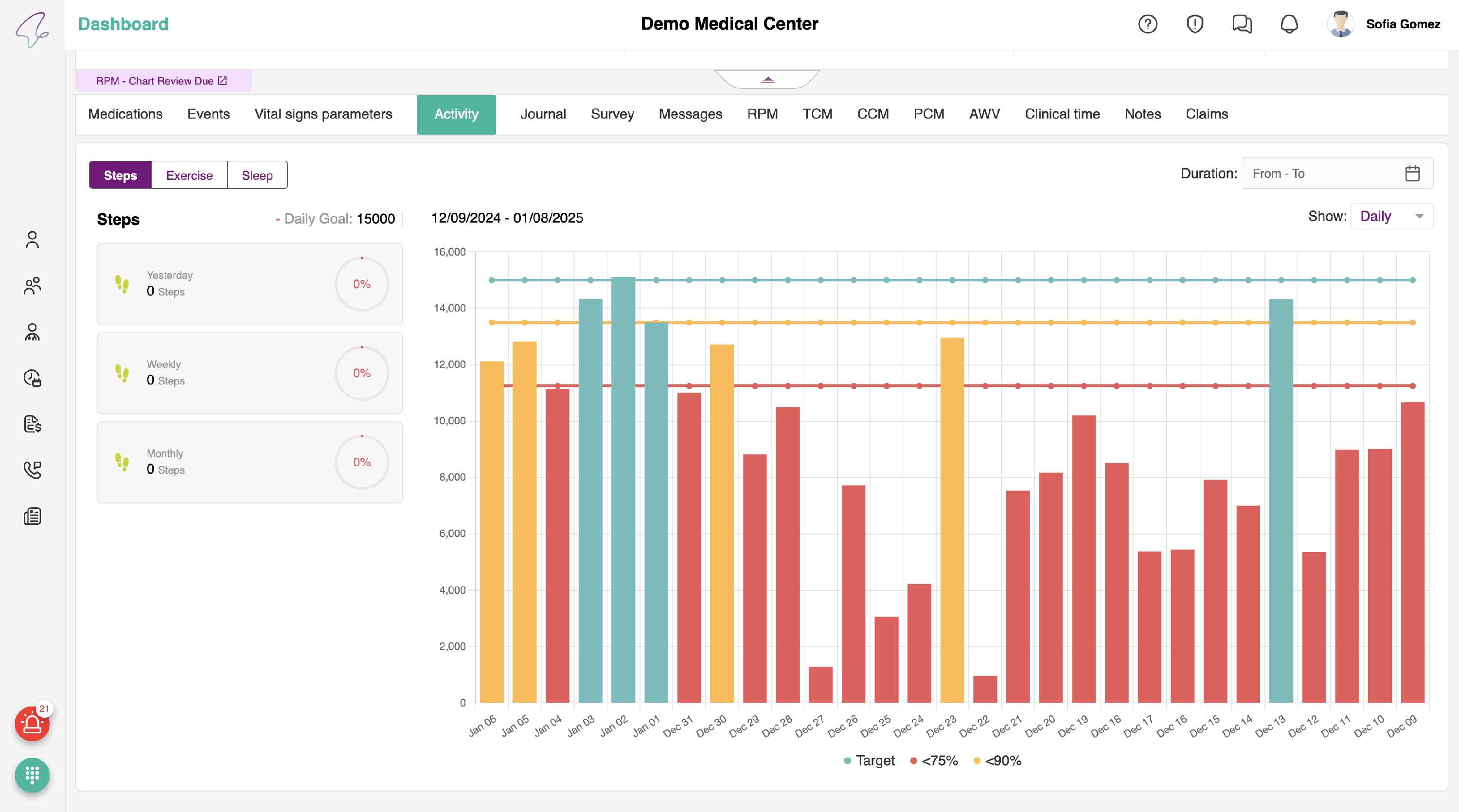 - Click on the Activity tab, to view Patient Activity. There are 3 sub tabs as follows - Steps, Exercise, and Sleep.