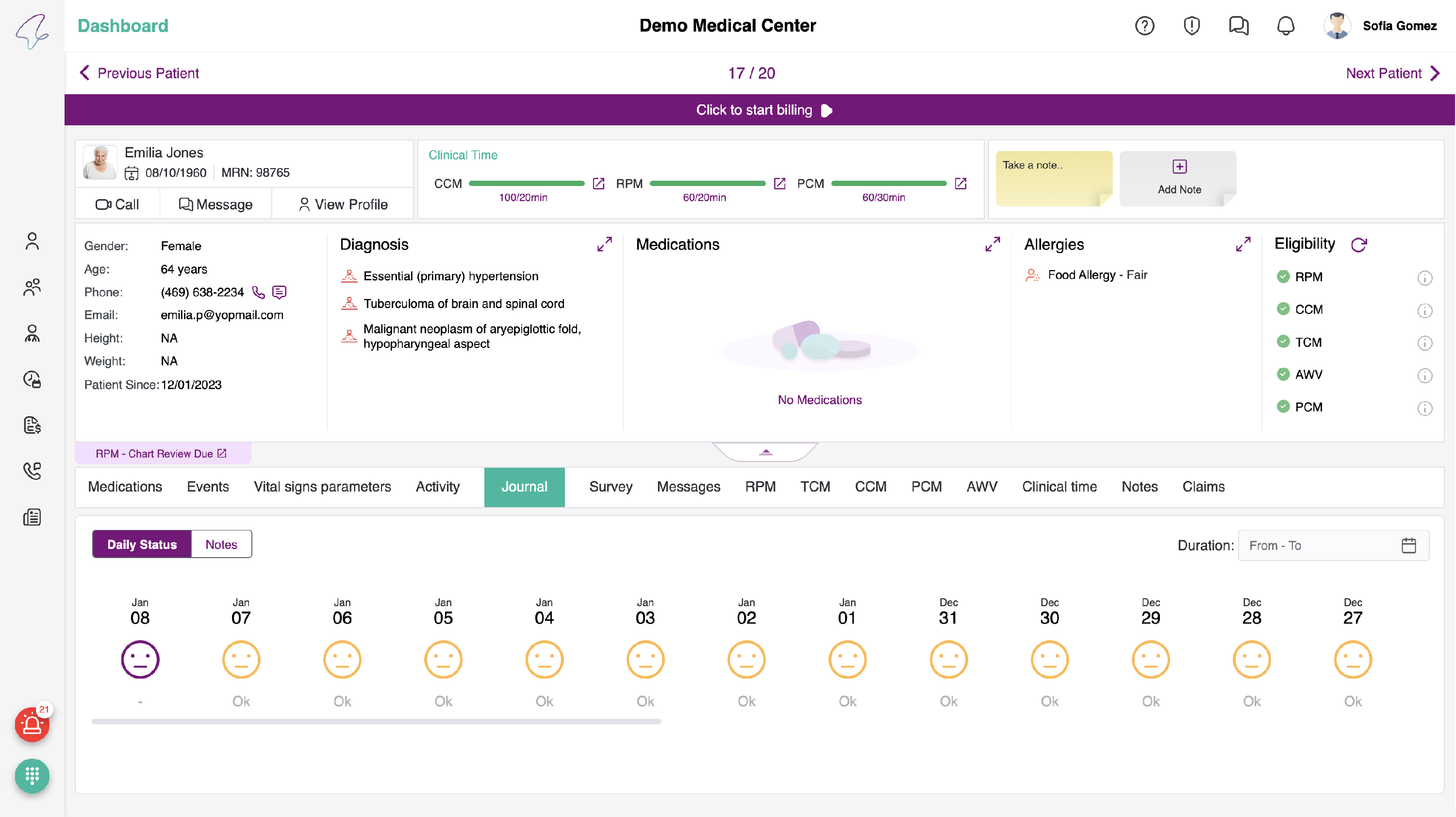 - Click on the Journal tab, to view Patient Journal. There are 2 sub tabs as follows: