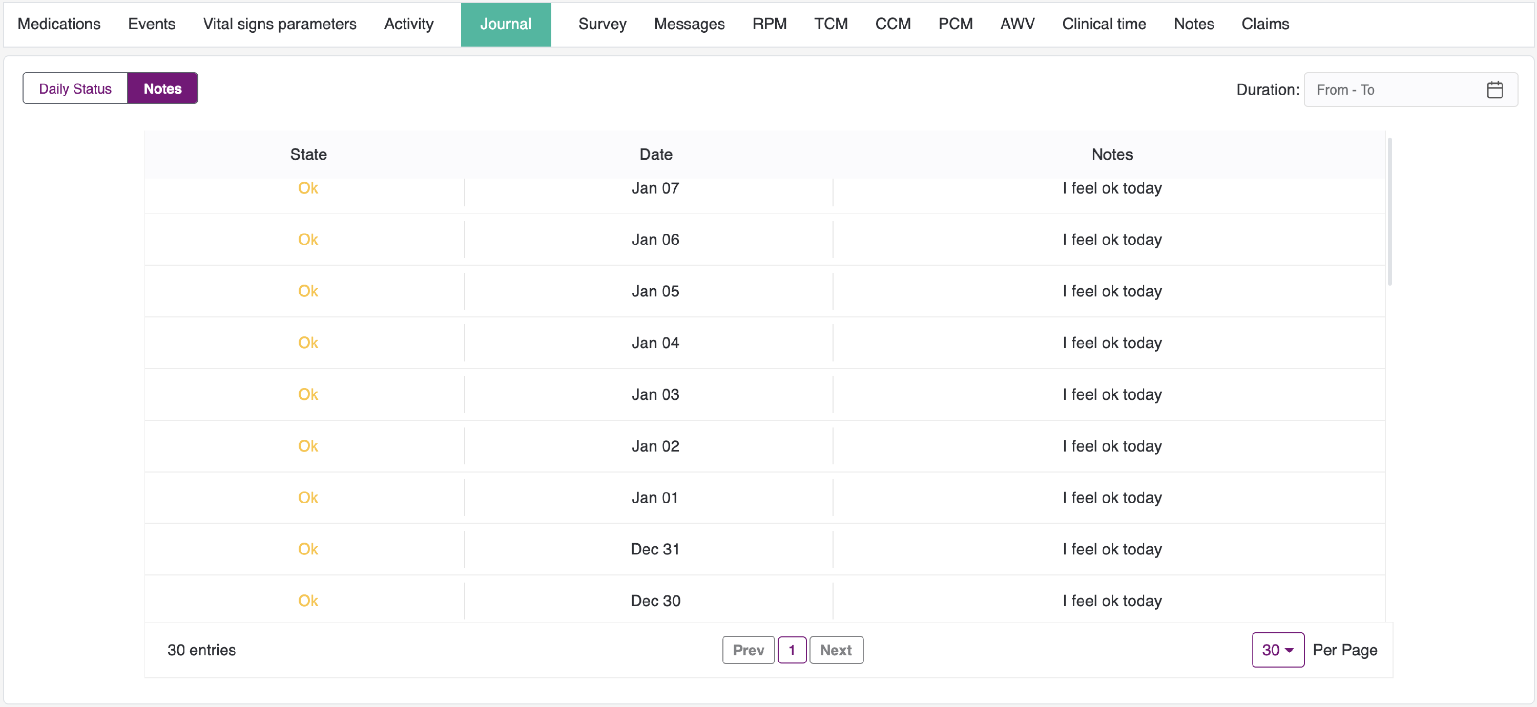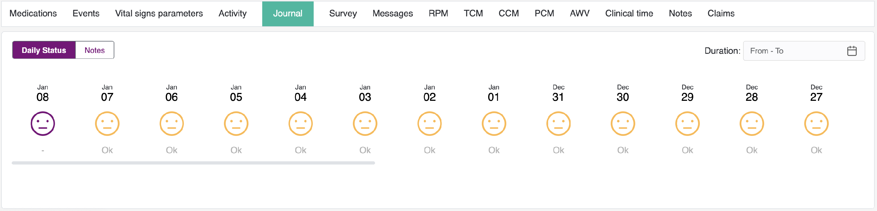 - When the patient submits a journal, the Date, emotion and the notes he mentioned can be viewed here.