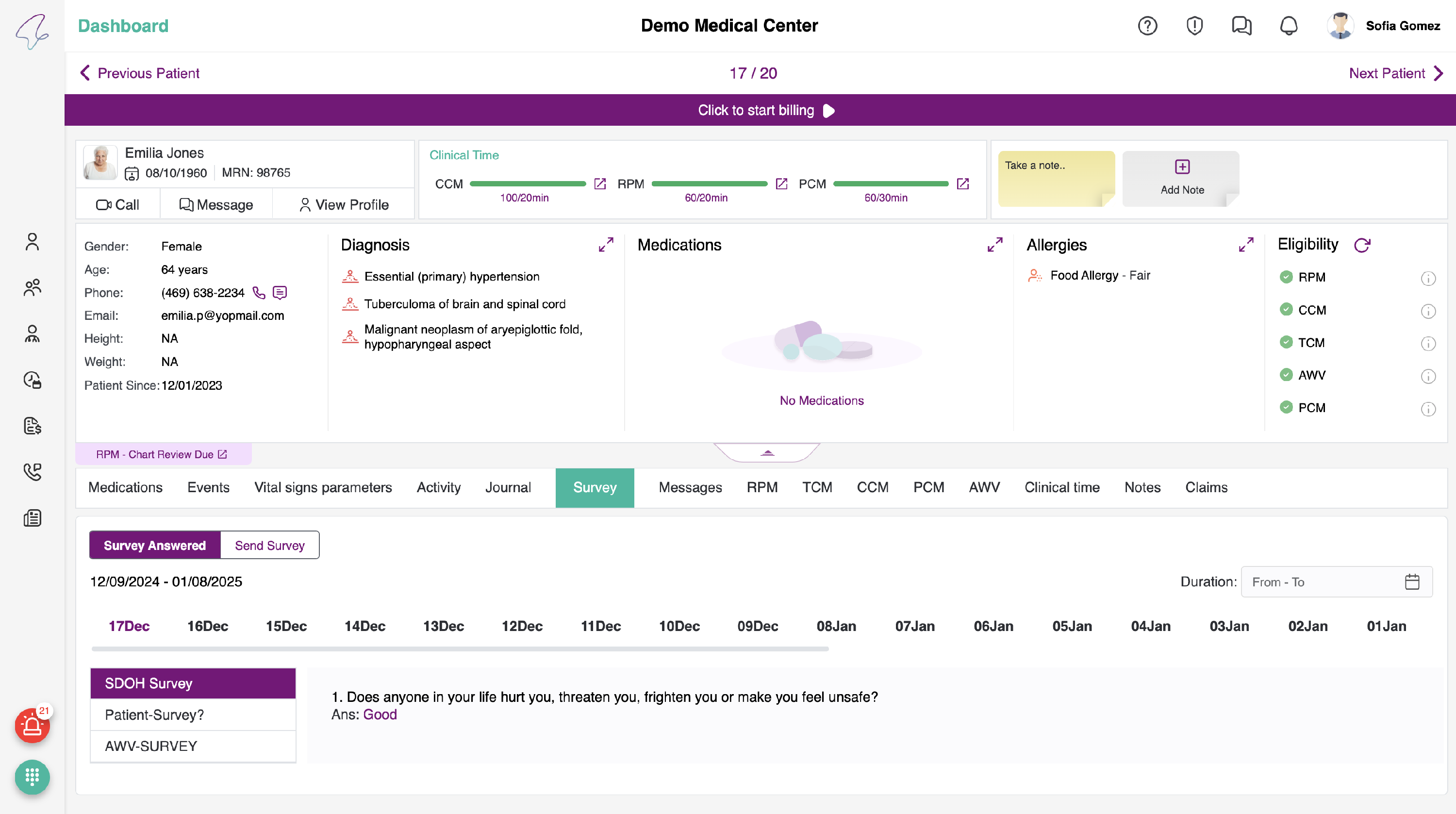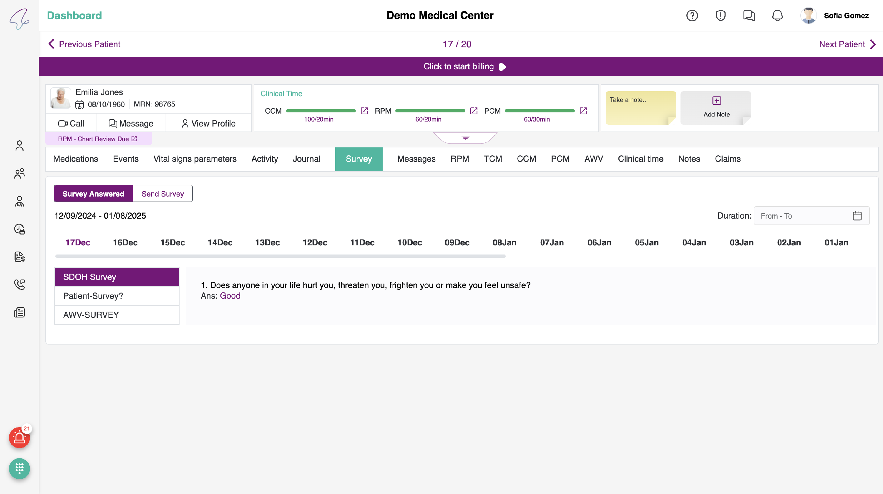 - In the Survey History, you can see the surveys that you have sent to the patient to answer. It includes the time and date, serving as a log history for future reference.