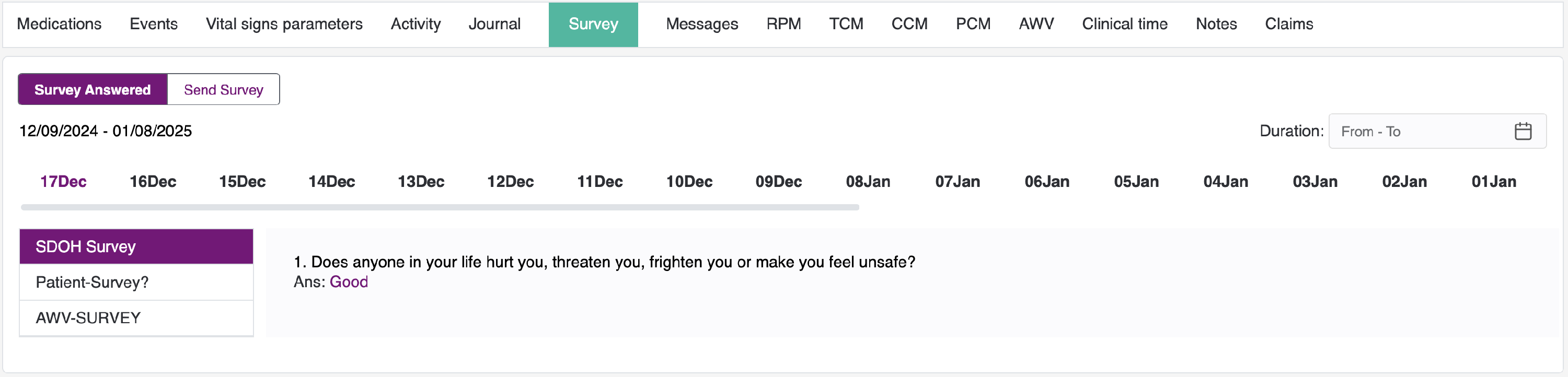 - To view Surveys assigned to the patient. Surveys can be assigned based on the Patient Status and Period - Daily, Weekly and Monthly