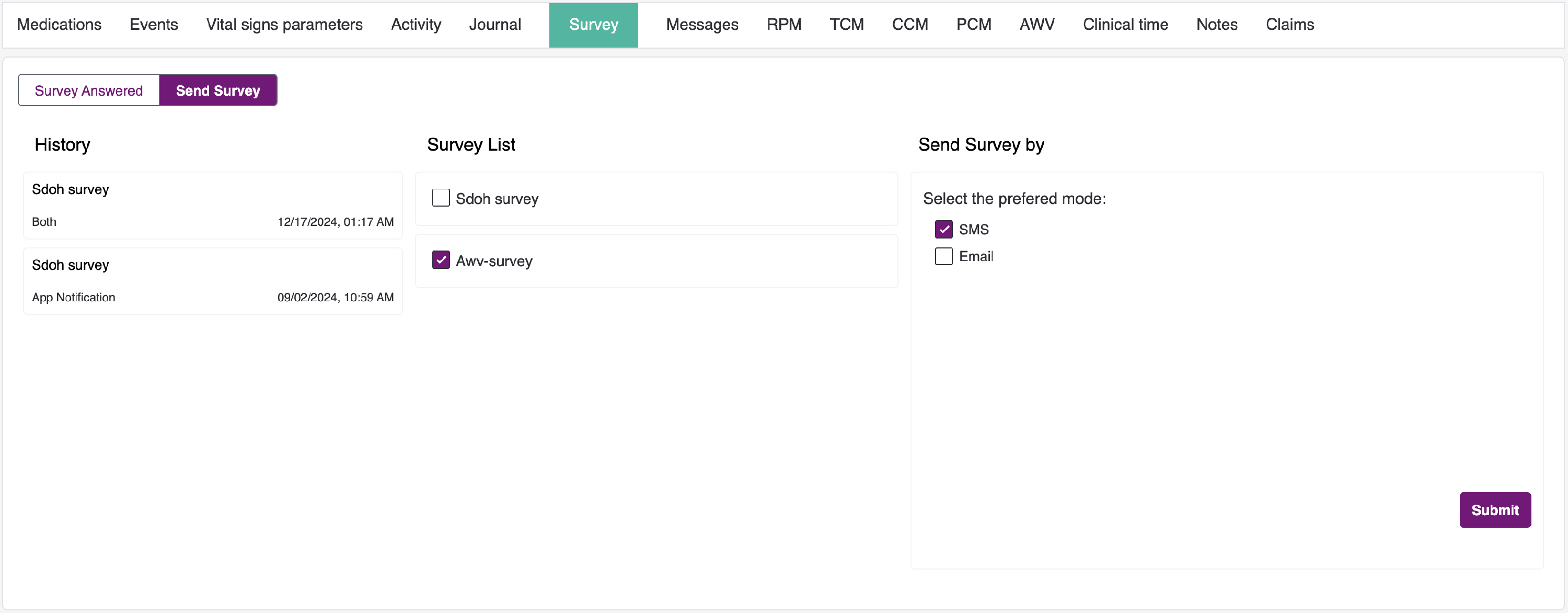 - To send the survey to the patient, select the survey from the survey list that you would like to send and choose an option (you can select single or both options) which are email and SMS. Then click on submit.