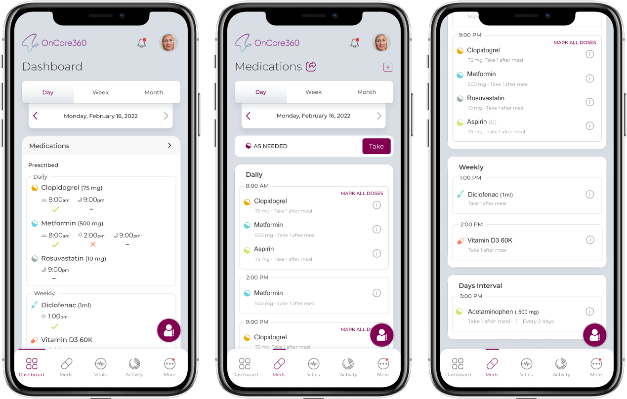 - As needed- You will see an option to take your “as needed” medicines at the right in the Daily section. On clicking, it displays list of Days interval medicine to be take, if no as needed medicine available this section will not be shown.