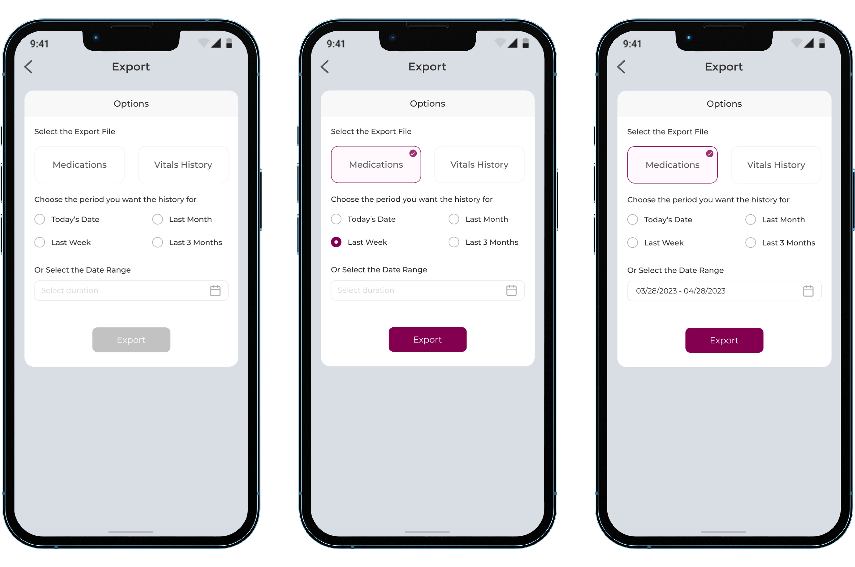 - You can view export option beside Medications. On clicking it, you will view the following screen, where you get to select either Medications or Vitals.