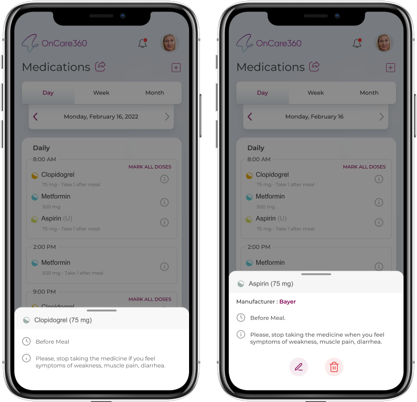 - An info icon will be available beside each medicine, taping on which displays medicine name , when to take the medicine, Manufacturer's details, and general usage instructions. You will also have edit and delete options for only patient added medications.