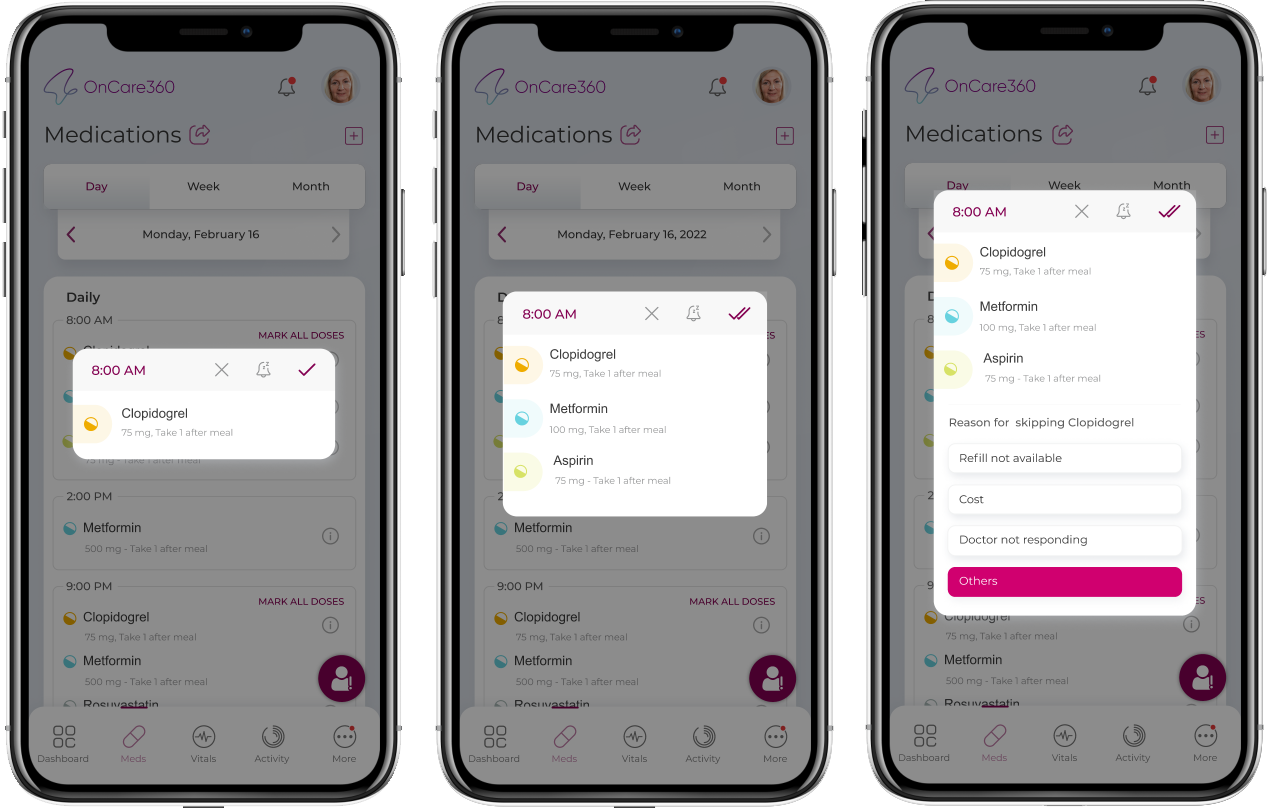- Patient can also tap on individual medicine name and view option to mark the dose as taken/missed or snooze