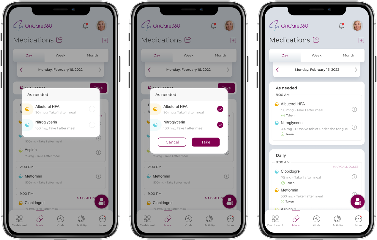 - In the Dashboard screen, we have an option to take the As Needed Medicines. You can a card below the calendar component with Take button.